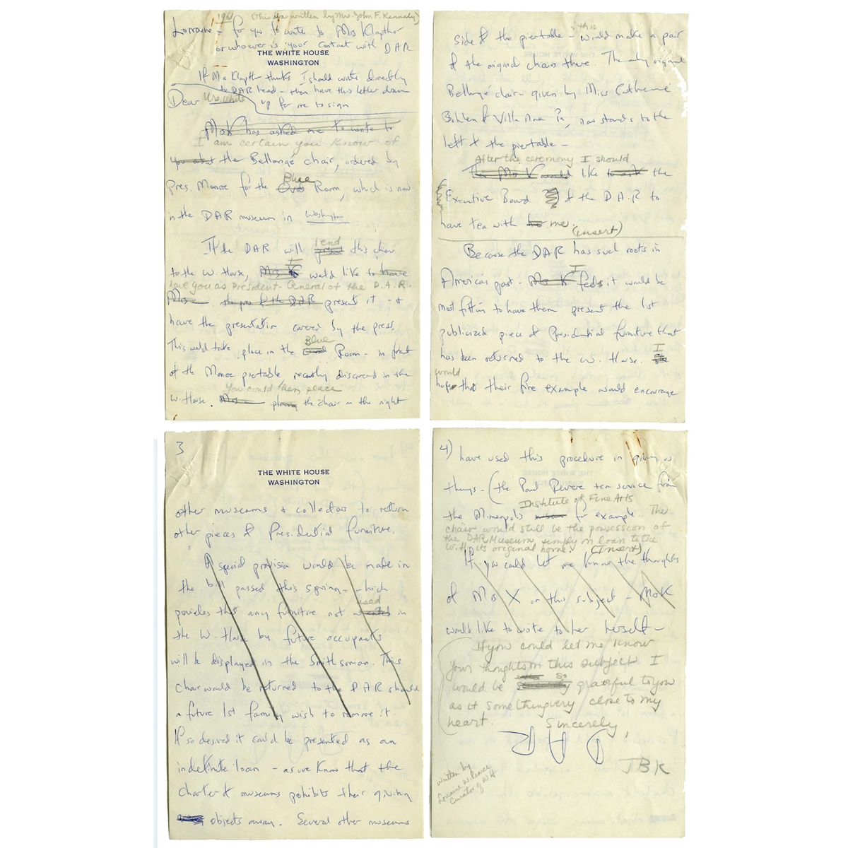 Jackie Kennedy autograph letter as First Lady on four pages of White House letterhead, undated, but likely October 1961. Letter, written in blue ink with pencil edits in her assistant's hand, is a draft letter to the President of the Daughters of the American Revolution regarding a chair that the First Lady hoped they would ''loan'' to the White House. Reads in part: ''…about the Bellange chair, ordered by Pres. Monroe for the Oval room, which is now in the DAR museum in Washington. If the DAR will present [crossed out and replaced with loan] this chair to the W. House…have the presentation covered by the press. This would take place in the Oval Room, in front of the Monroe pie-table, recently discovered in the W. House…The only original Bellange chair given by Miss Catherine Bohlen of Villa Nova, PA, now stands to the left of the pie-table. Then [I] would like to ask the Executive Board of the DAR to have tea…Because the DAR has such roots in America's past…it would be most fitting to have them present the 1st publicized piece of Presidential furniture that has been returned to the W. House…hope that their fine example would encourage other museums & collectors to return other pieces of Presidential furniture…if so desired it could be presented as an indefinite loan…'' Letter measures 5'' x 8'' and is in very good condition.