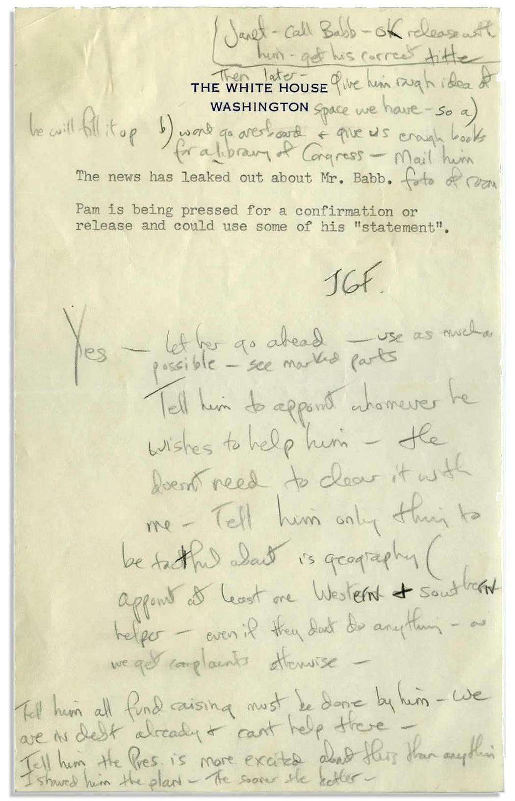 Jackie Kennedy autograph note unsigned as First Lady, regarding books to add to the White House library and mentioning Professor James Babb, who was given the task of assembling a definitive list of books for the White House: ''…Tell him the only thing to be tactful about is geography (appoint at least one Western & Southern helper - even if they don't do anything -- or we get complaints otherwise. Tell him the Pres. is more excited about this than anything. I showed him the plan -- the sooner the better…'' Measures 5'' x 8''. Near fine.