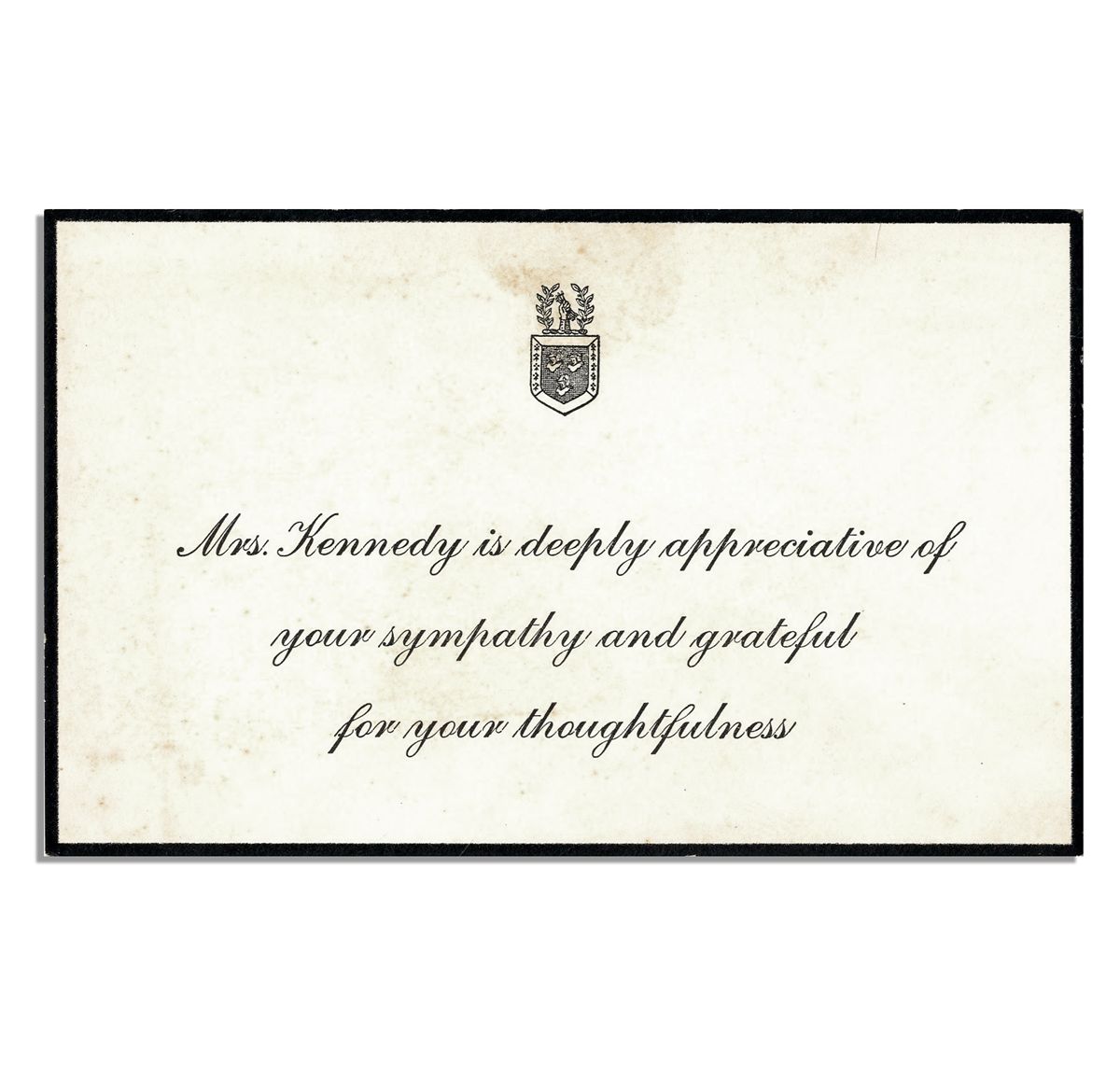 Card sent by Jackie Kennedy acknowledging condolences following the assassination of JFK. The printed card reads in full: ''Mrs. Kennedy is deeply appreciative of your sympathy and grateful for your thoughtfulness''. The matching hand-addressed envelope is included, featuring the printed franking signature of ''Jacqueline Kennedy''. Mourning card measures 5.5'' x 3.25''. Light foxing and toning with some edge wear, else near fine. Envelope, also with black mourning border is more heavily foxed, in good condition.