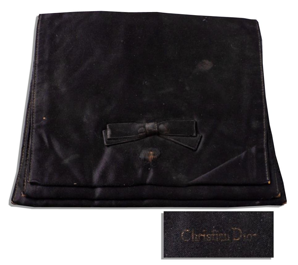 Jackie Kennedy's black satin Dior clutch. Elegant evening bag features a subtly trapezoidal form decorated with a bow on the front flap and ''Christian Dior'' in gilt lettering. Interior has four compartments and exterior has one. Measures 9'' x 7.25''. Wear to fabric near the bow and on the corners, else near fine. Provenance from the family of James H. Boyer, Sr., U.S. Capitol Police Officer and chauffeur to the Kennedys.