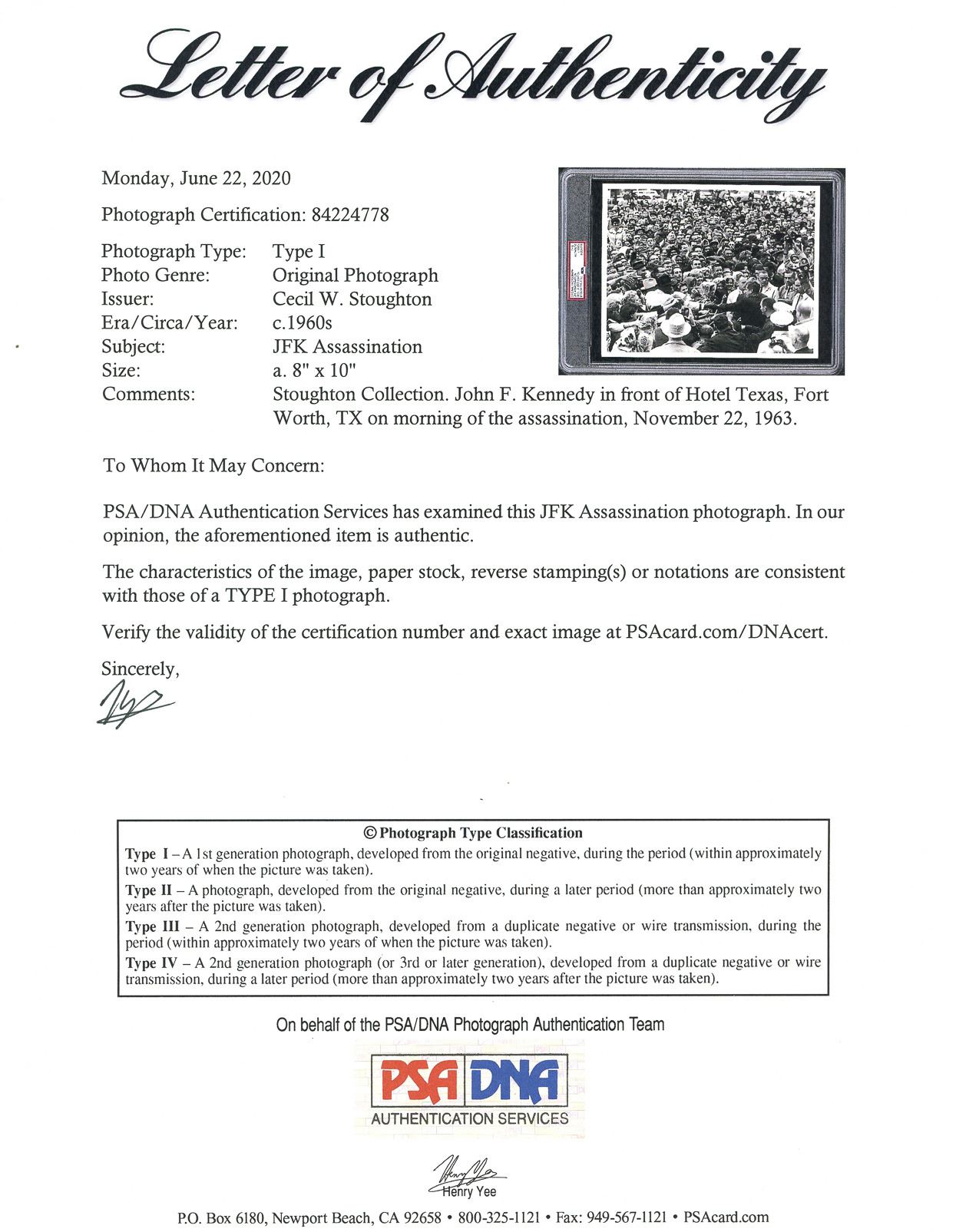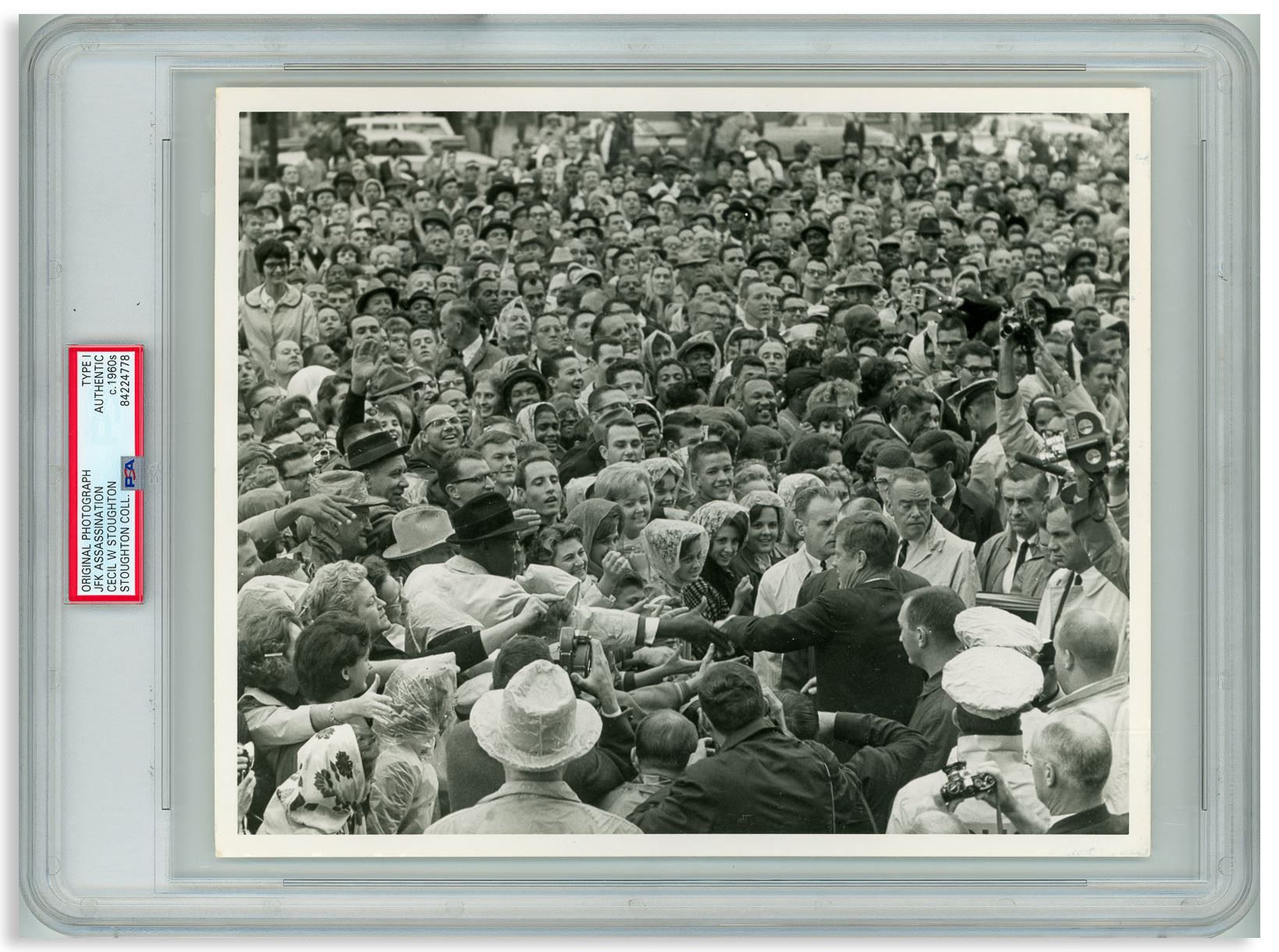 Original 10'' x 8'' photograph of John F. Kennedy, taken the morning of the assassination on 22 November 1963 in front of Hotel Texas in Ft. Worth, Texas. Powerful photograph by White House photographer Cecil W. Stoughton shows JFK extending his arm out into the crowd, with a black man prominent on the left side of the photo, also extending his arm out to shake Kennedy's hand. Photo is encapsulated by PSA, identifying it as a Type I photo, from the original negative, developed shortly after the photo was taken. Near fine condition.