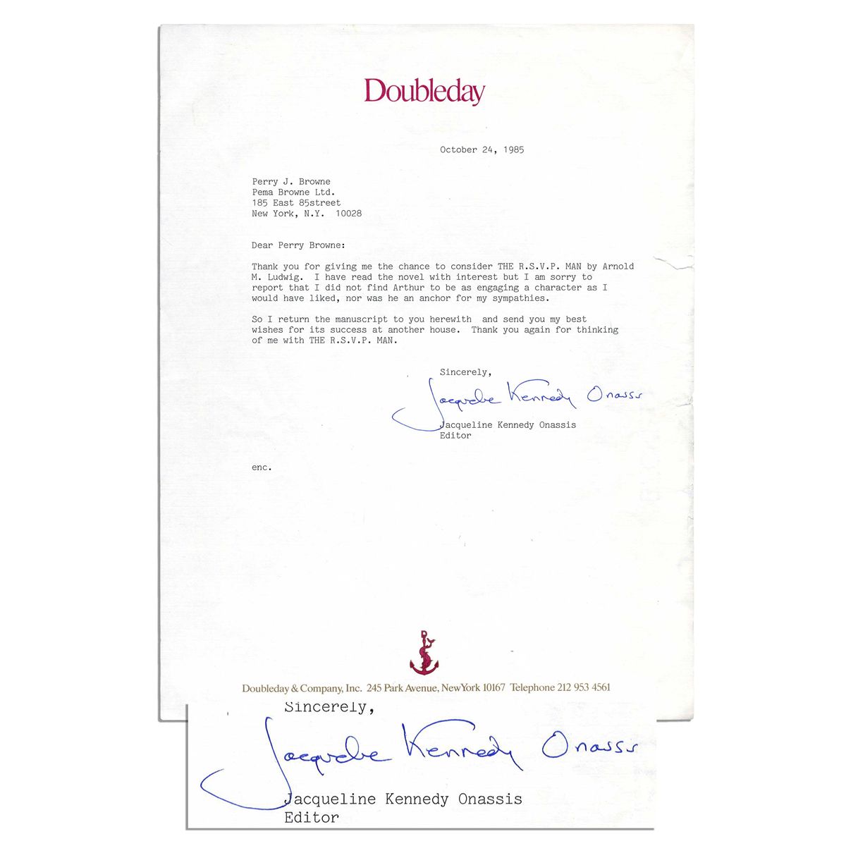 Jackie Kennedy typed letter signed as Doubleday Editor, dated 24 October 1985 on company stationery to psychiatrist and now-published author Arnold M. Ludwig's agent at Pema Browne Ltd. Letter reads in part, ''…Thank you for giving me the chance to consider THE R.S.V.P. MAN…So I return the manuscript to you herewith...'' Signed ''Jacqueline Kennedy Onassis''. Literary rejection letter measures 8.5'' x 11'' and shows some creasing, mild chipping and a small tear measuring under an inch on the right side, else near fine condition.