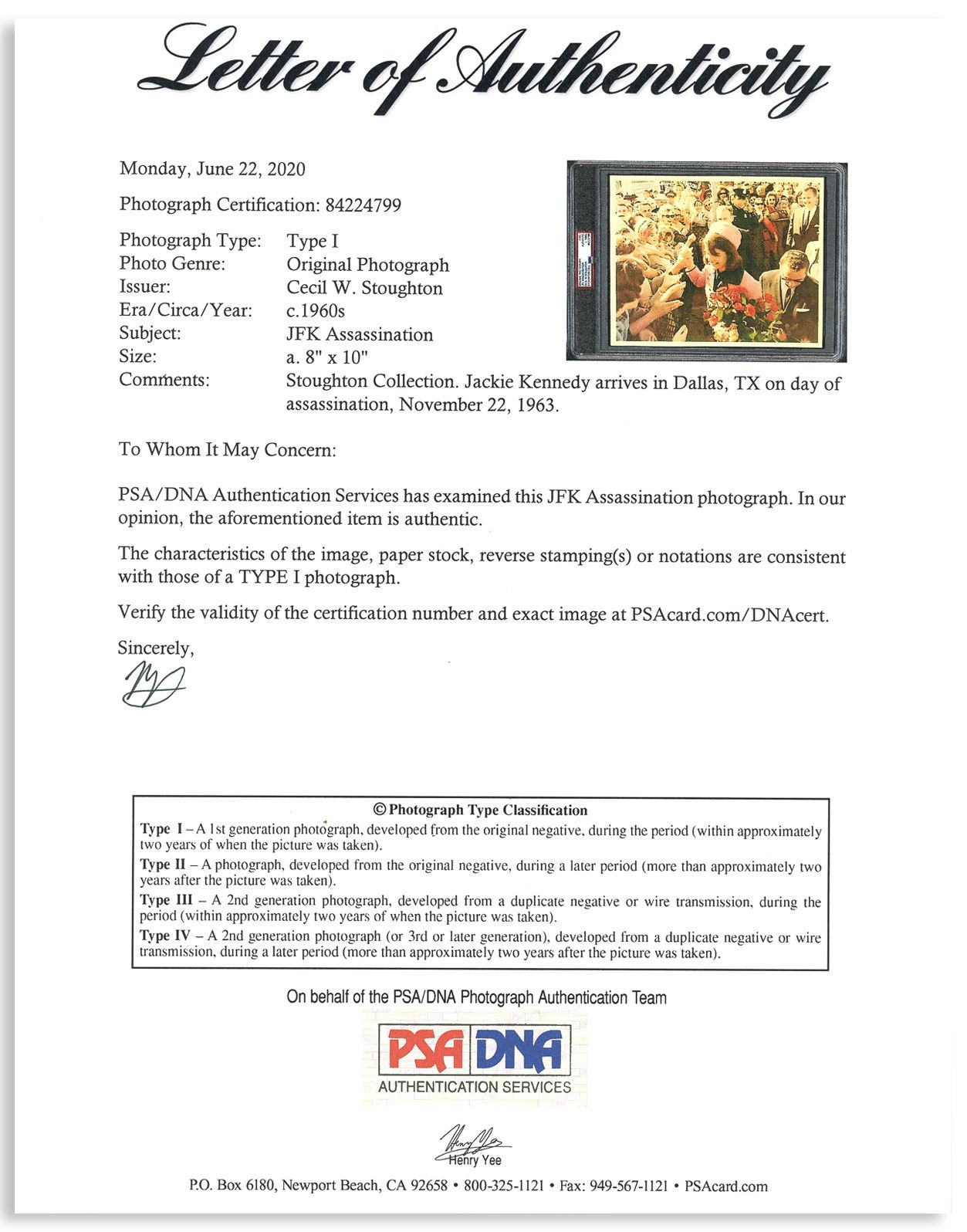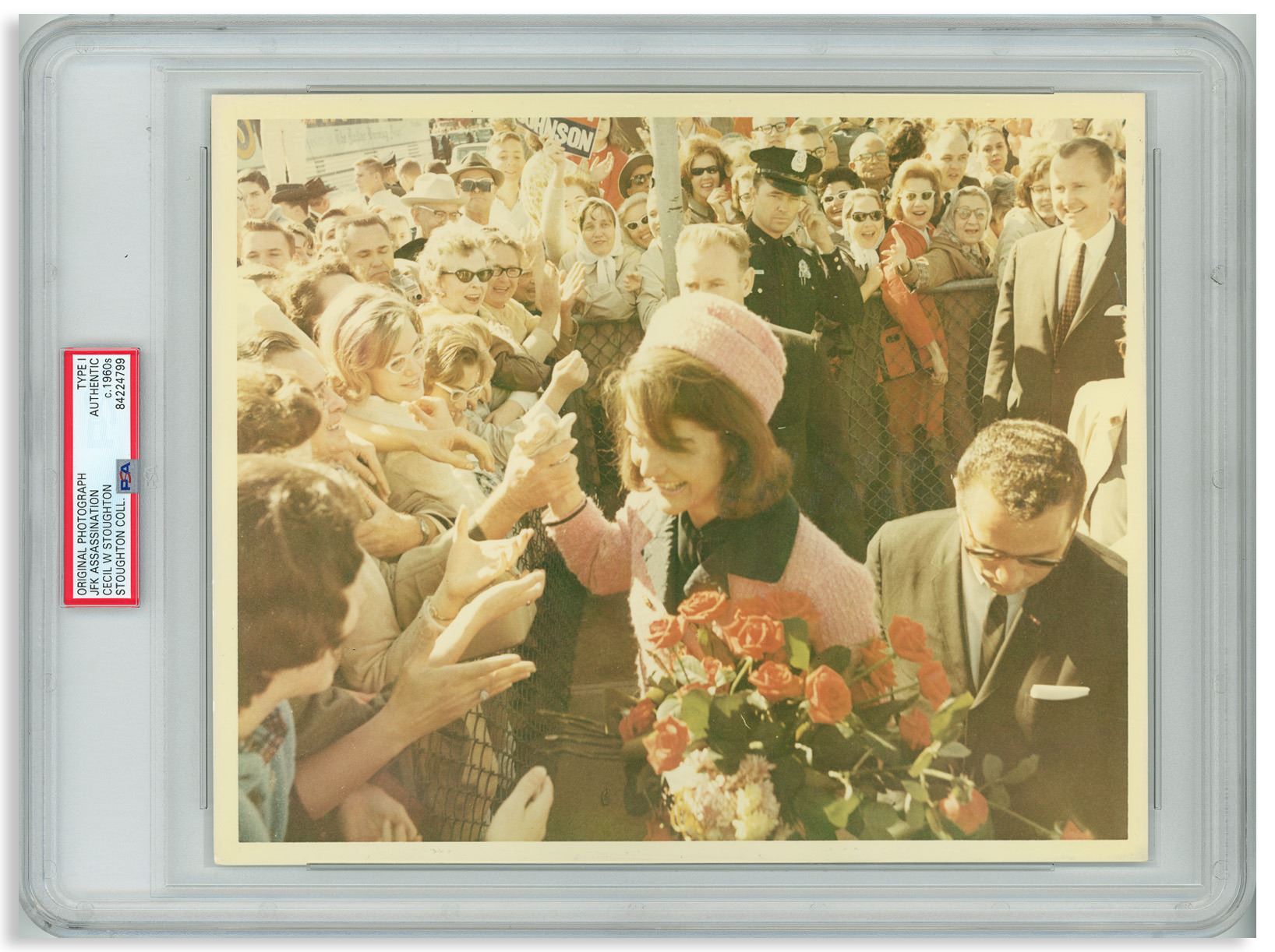Original 10'' x 8'' photograph of Jackie Kennedy, taken the morning of the assassination on 22 November 1963 by White House photographer Cecil W. Stoughton. Instantly recognizable in the pink Chanel suit, Jackie greets an adoring crowd in Dallas while holding a bouquet of red roses. Photo is encapsulated by PSA, identifying it as a Type I photo, from the original negative, developed shortly after the photo was taken. Near fine condition.