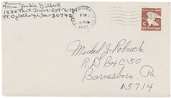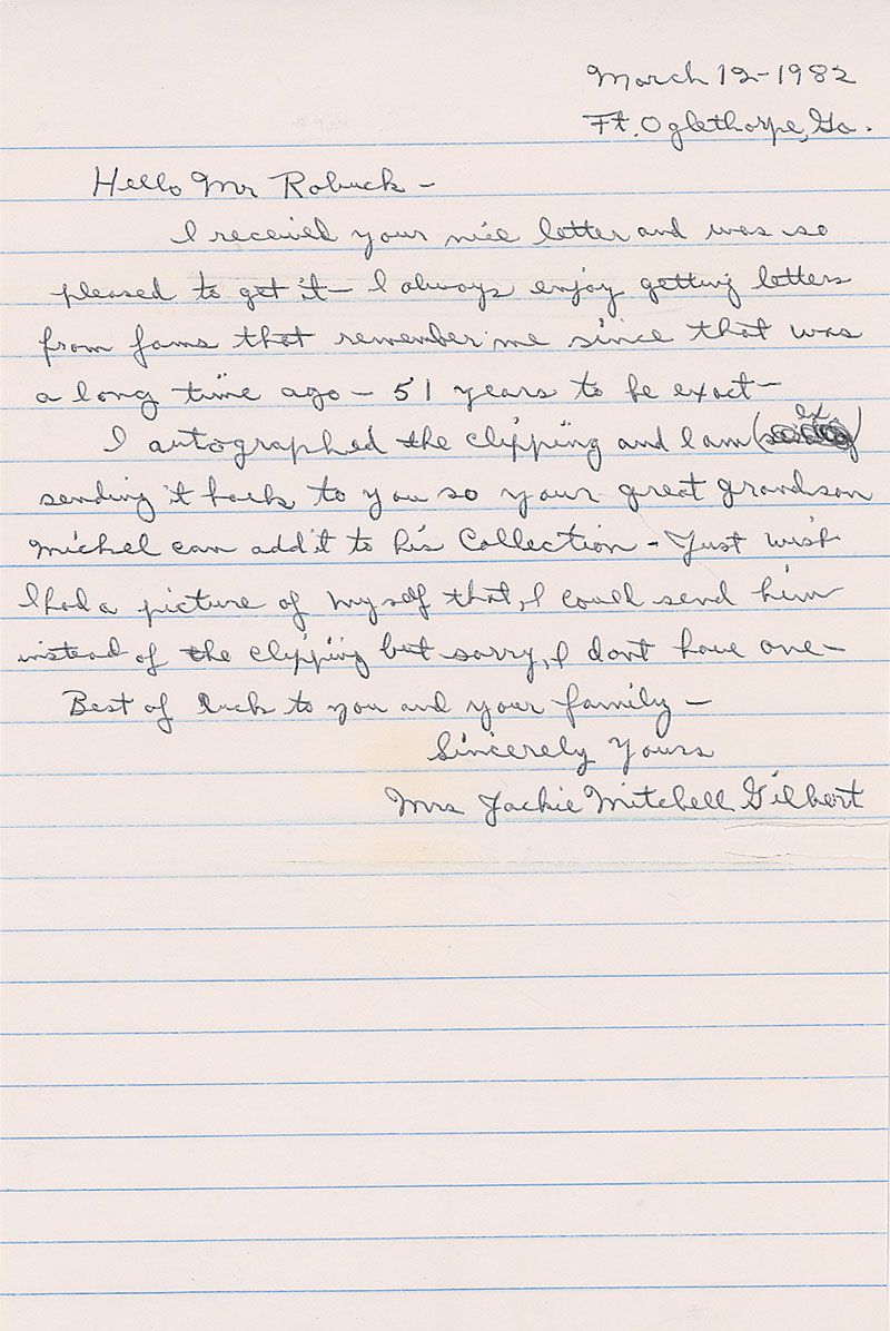 One of the first female pitchers in professional baseball history, who struck out Babe Ruth and Lou Gehrig in an exhibition game (1912–1987). ALS, one page, lightly-lined, 6 x 9, March 12, 1982. Letter to an admirer. In part: “I always enjoy getting letters from fans that remember me since that was a long time ago—51 years to be exact.” A small tear below the signature, otherwise fine condition. Accompanied by the original mailing envelope, which also bears her signature in the return address area.