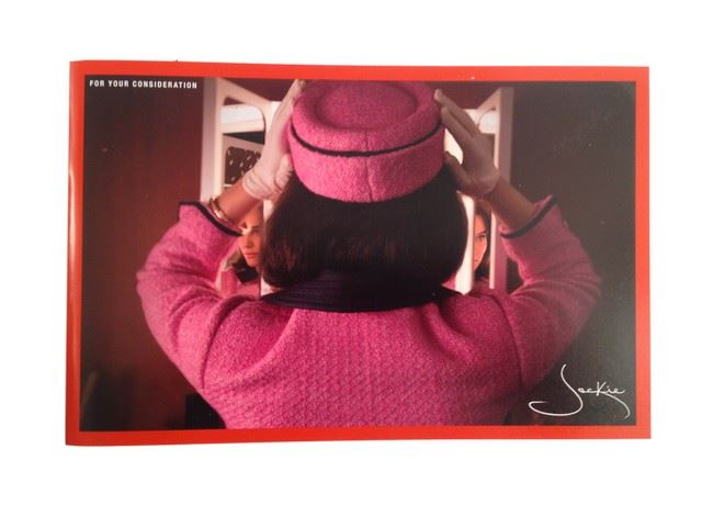 A collection of promotional items from the movie "Jackie". This lot includes a best original screenplay Jackie soft cover script written by Noah Oppenheim, (approx. 5.5" x 8.5"), a "Jackie" picture book (7"x10"), and an original motion picture "Jackie" soundtrack album CD, produced by Milan records (approx. 5" x 5").