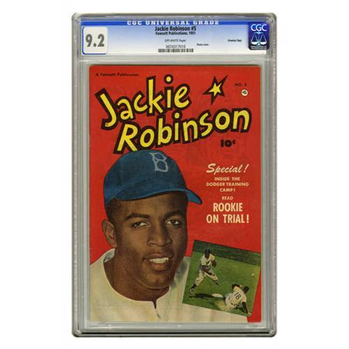 <B>Jackie Robinson #5 Crowley Copy pedigree (Fawcett, 1951) CGC NM- 9.2 Off-white pages.</B></I> Oh, for the days when "Da Bums" ruled Ebbets Field in Brooklyn! Brightest of the Dodger stars was of course Jackie Robinson, who is featured here with photo front and back covers. This prize pedigreed copy shines pretty brightly itself, with wonderful cover colors that pop off the page. Overstreet 2005 NM- 9.2 value = $575. CGC census 12/05: 1 in 9.2, none higher.