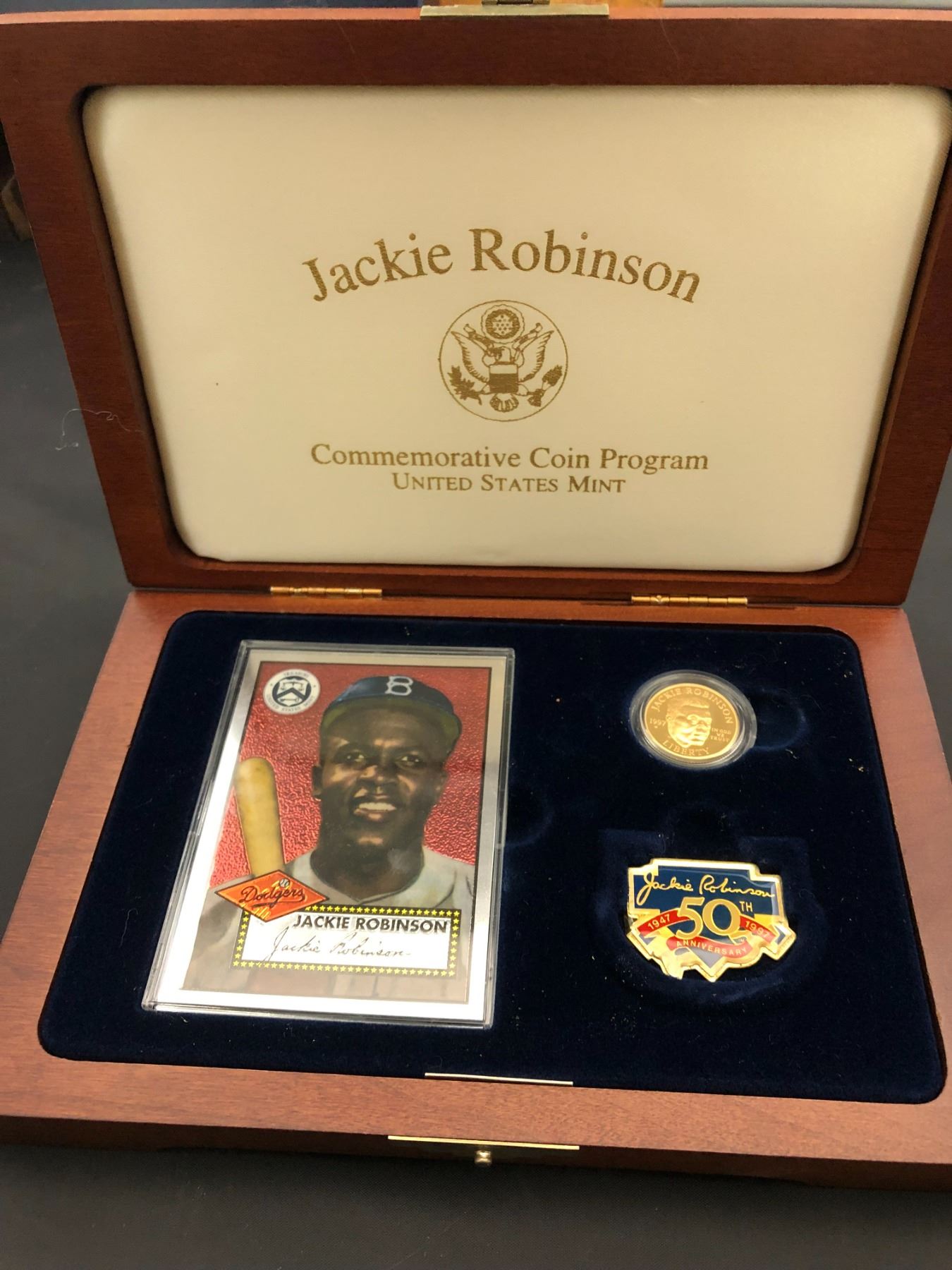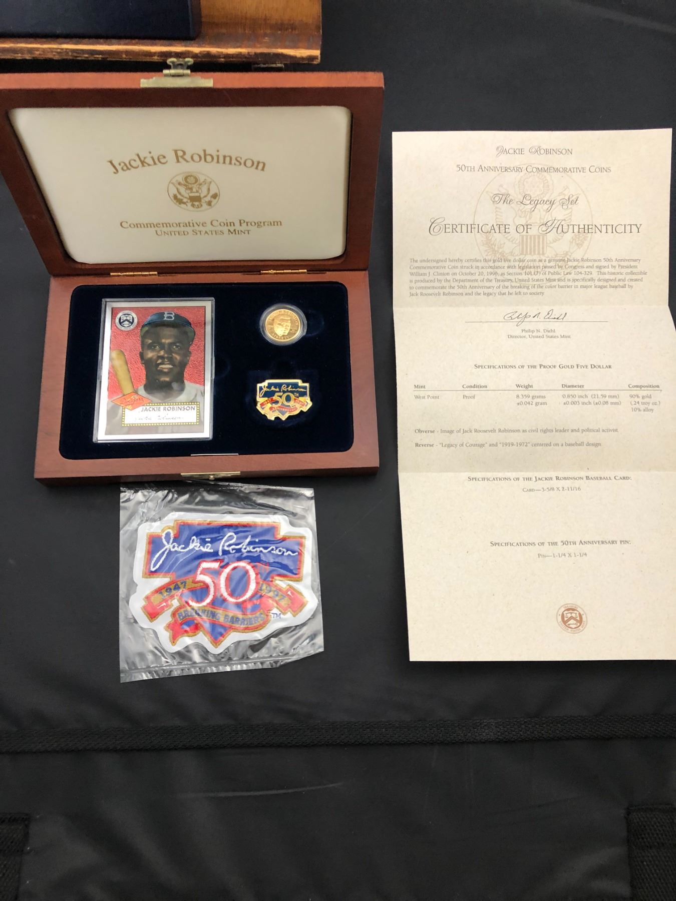 Includes $5 gold commemorative, baseball card, and 50th anniversary pin, plus patch. In box with COA.