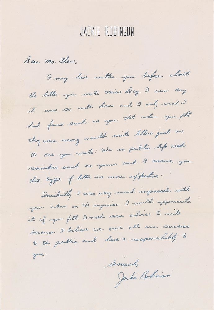 Extremely rare ALS, one page, 7.25 x 10.5, personal letterhead, no date but postmarked December 22, 1951. Letter to Mort Shaw of Brooklyn, in full: "I may have written you before about the letter you wrote Miss Day. I can say it was so well done and I only wish I had fans such as you that when you felt they were wrong would write letters just as the one you wrote. We in public life need reminders such as yours and I assure you that type of letter is more effective. Incidentally I was very much impressed with your ideas on the injuries. I would appreciate it if you felt I need some advice to write because I believe we owe all our success to the public and have a responsibility to you." In fine condition. Accompanied by the original mailing envelope addressed in Robinson's hand. Robinson is very scarce in autograph letters, this being just the fourth we have offered. This example dates to his legendary playing career with the Brooklyn Dodgers; after a heartbreaking 1951 season, Robinson would lead the Dodgers to the National League pennant in 1952. Robinson had broken baseball's color barrier only years earlier in 1947, tactfully dealing with insults and epithets hurled at him by a prejudiced public. This letter demonstrates the humility and grace that made Robinson successful in his "public life" on and off the field.