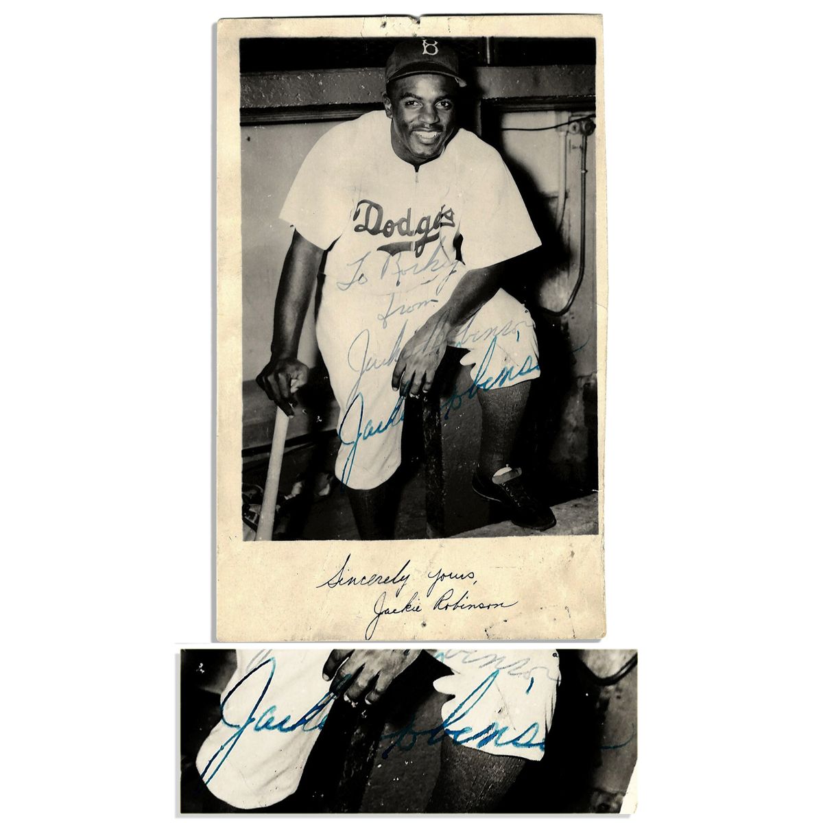 Spectacular Jackie Robinson twice-signed photo postcard, depicting the legendary player in his Dodgers uniform. Inscribed and signed in blue pen: ''To Rocky, From Jackie Robinson'' and then additionally signed underneath in darker green pen, ''Jackie Robinson''. 3.25'' x 5.5'' photo also has a printed signature on the border underneath photo. Three pin holes and minor tape residue in spots, overall in very good condition. Includes original envelope to the recipient, postmarked 25 August 1957. With PSA/DNA COA for both signatures.