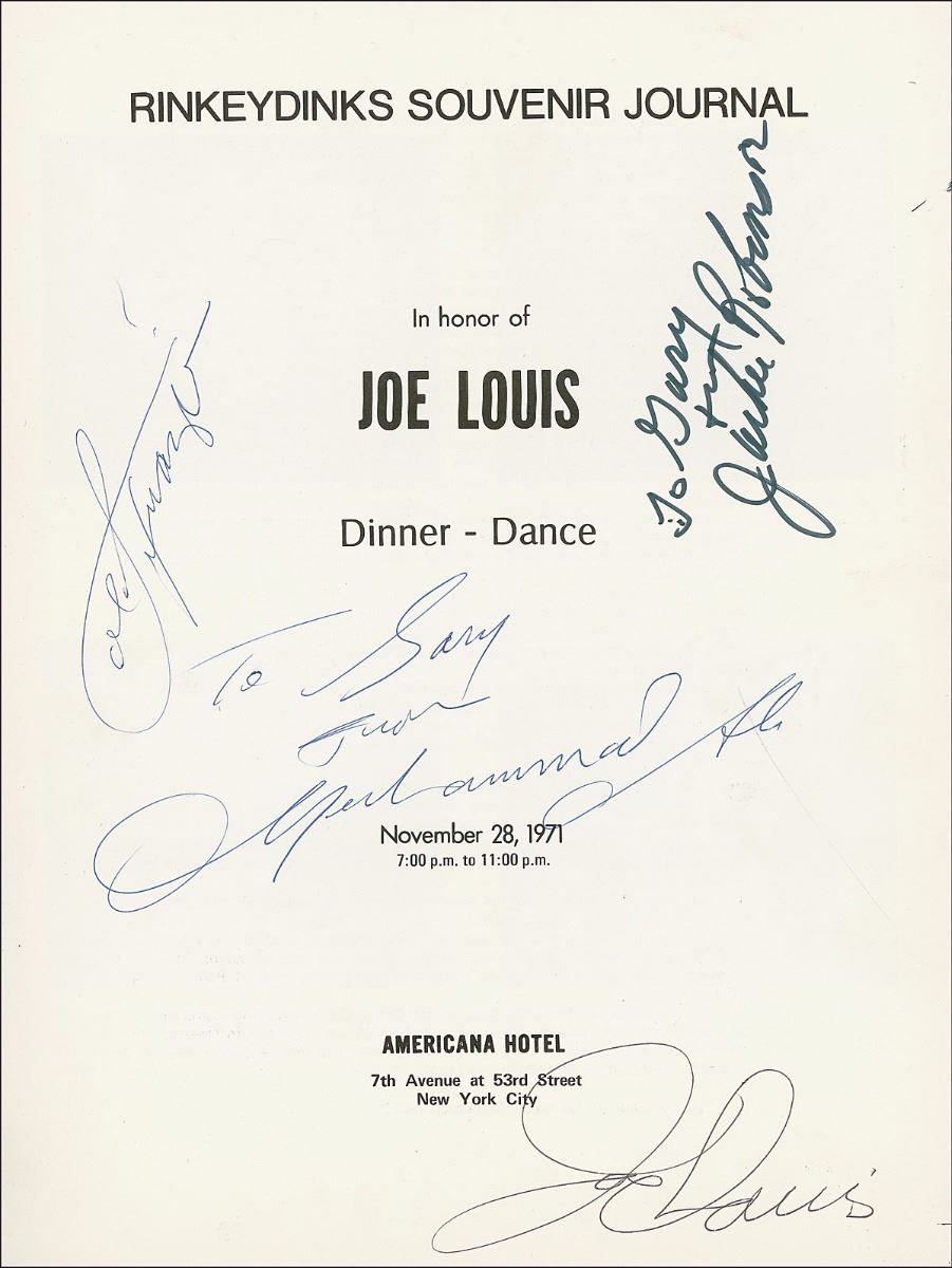 Remarkable program from a dinner–dance honoring Joe Louis, held at the Americana Hotel in New York on November 28, 1971, 8.5 x 11, forty pages, signed and inscribed on the first page in felt tip, “To Gary, from Jackie Robinson,” and also signed in ballpoint by Joe Louis, Joe Frazier, and Muhammad Ali, who also inscribes to Gary. In fine condition. A stunning ensemble of four of the greatest African American athletes of the 20th century.
