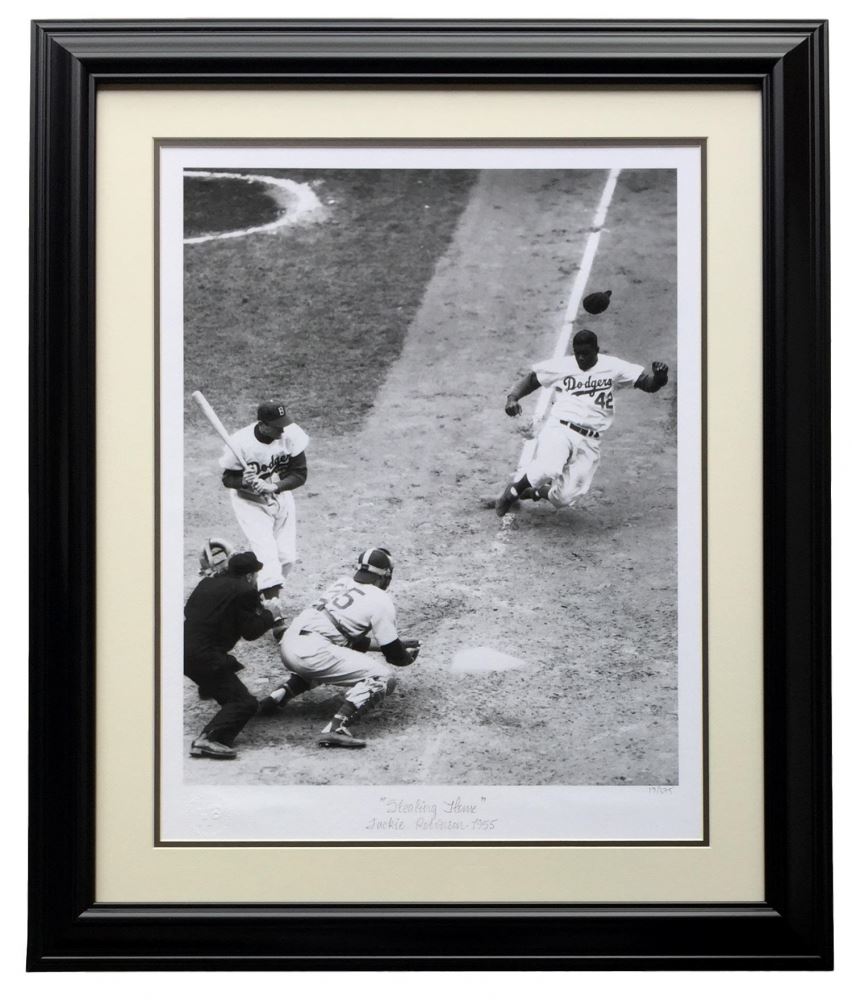 The custom frame measures 24" x 29" in size and features an 18" x 23" lithograph of Jackie Robinson. Please note, the autograph is a facsimile. Please note, the images shown are stock images. The winning bidder will receive a random number from the same edition.