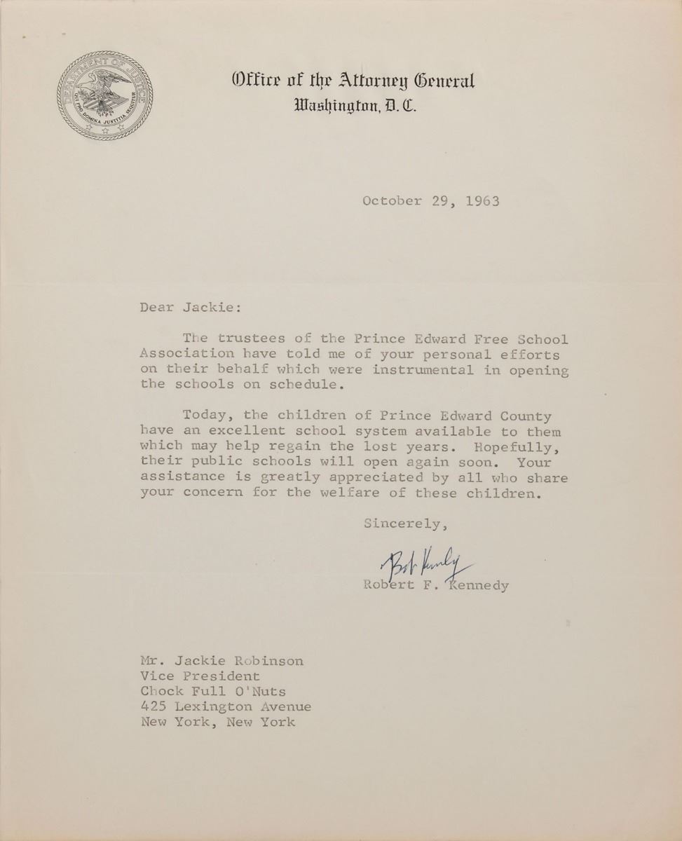 Robert F. Kennedy’s letters all boast significant civil rights content. The first, signed “Robert F. Kennedy” and “Many thanks, RFK,” May 11, 1961, in part: “We intend to follow through with vigorous enforcement of the civil rights laws and I believe we will make progress. However, the record will speak for itself three or four years from now. You will make a judgement and so will the people of the United States, a well as those overseas. You have made a great contribution in the civil rights field and you can be of considerable assistance in seeing that we keep moving ahead.” His second letter, signed “Bob Kennedy,” June 2, 1961, in part: “It is going to be a long struggle but I am certain we will make a good deal of progress.” In a letter signed “Bob,” November 13, 1962, Kennedy writes, “There is no question in my mind that the progress which was made in the last 22 months will be sustained and accelerated in the next two years. It is good to know that we have the support of men like yourself who are making such a positive contribution to the advancement of civil rights and human liberties.” His fourth letter thanks Robinson for his efforts in supporting the Prince Edward County Free School Association, developed to provide education to black students in Virginia in the wake of public school closures following the Brown v. Board decision.