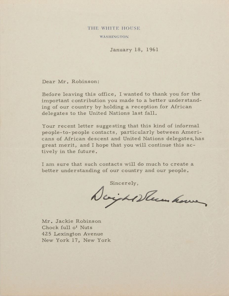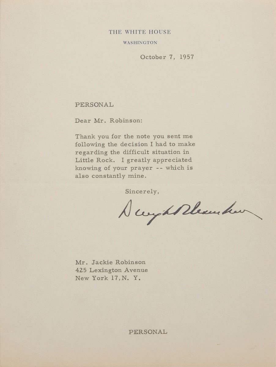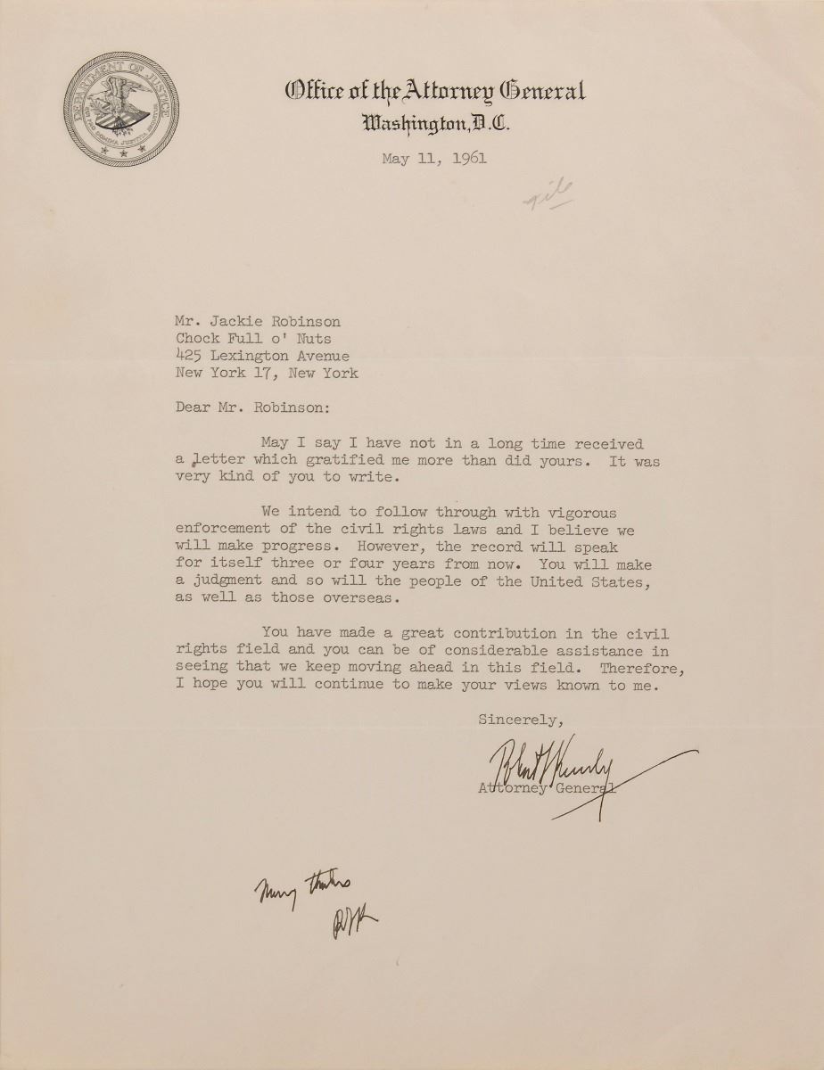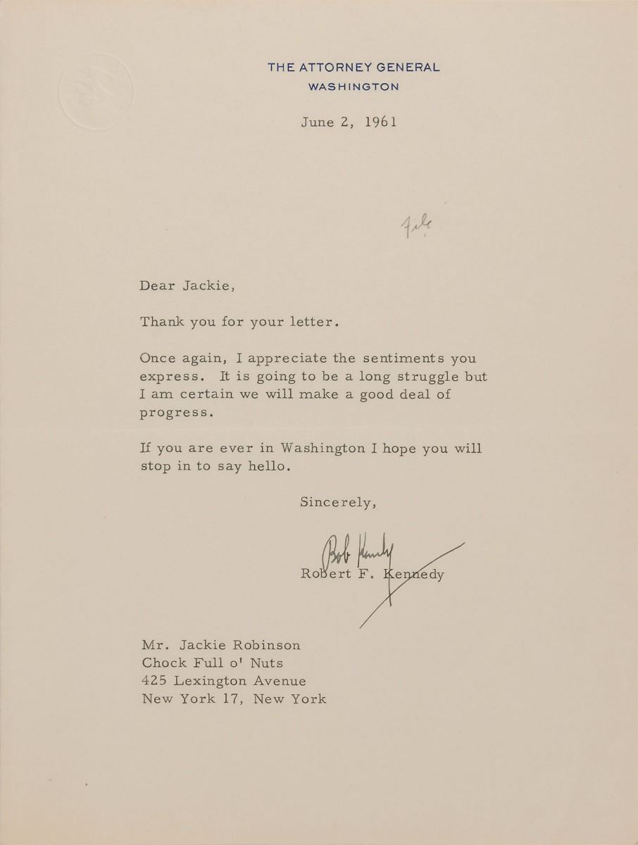 Historically interesting archive of six TLSs to Jackie Robinson, two by Dwight D. Eisenhower as president and four by Robert F. Kennedy as attorney general, totaling six pages, dated from 1957 to 1962. The first Eisenhower letter, October 7, 1957, in part: “Thank you for the note you sent me following the decision I had to make regarding the difficult situation in Little Rock. I greatly appreciated knowing of your prayer—which is also constantly mine.” Eisenhower’s second letter, written on January 18, 1961, just two days before leaving the White House, in part: “Before leaving this office, I wanted to thank you for the important contribution you made to a better understanding of our country by holding a reception for African delegates to the United Nations last fall. Your recent letter suggesting that this kind of informal people-to-people contacts, particularly between Americans of African descent and United Nations delegates, has great merit, and I hope that you will continue this actively in the future.”