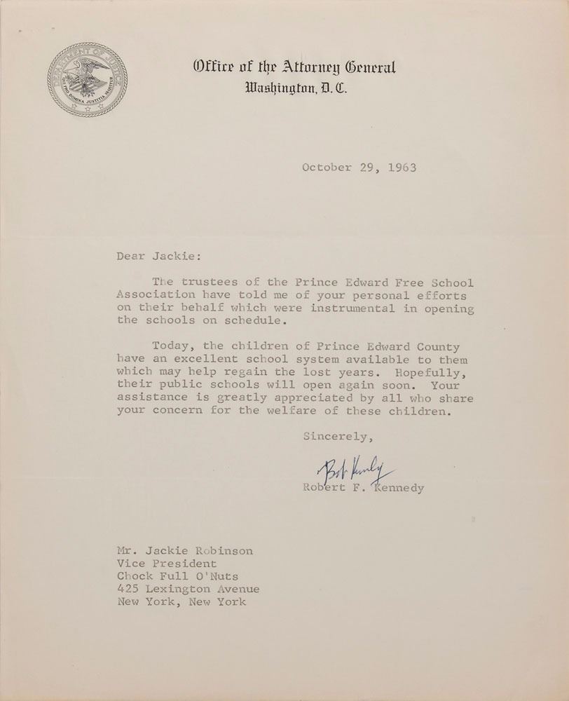Robert F. Kennedy's letters all boast significant civil rights content. The first, signed "Robert F. Kennedy" and "Many thanks, RFK," May 11, 1961, in part: "We intend to follow through with vigorous enforcement of the civil rights laws and I believe we will make progress. However, the record will speak for itself three or four years from now. You will make a judgement and so will the people of the United States, a well as those overseas. You have made a great contribution in the civil rights field and you can be of considerable assistance in seeing that we keep moving ahead." His second letter, signed "Bob Kennedy," June 2, 1961, in part: "It is going to be a long struggle but I am certain we will make a good deal of progress." In a letter signed "Bob," November 13, 1962, Kennedy writes, "There is no question in my mind that the progress which was made in the last 22 months will be sustained and accelerated in the next two years. It is good to know that we have the support of men like yourself who are making such a positive contribution to the advancement of civil rights and human liberties." His fourth letter thanks Robinson for his efforts in supporting the Prince Edward County Free School Association, developed to provide education to black students in Virginia in the wake of public school closures following the Brown v. Board decision.