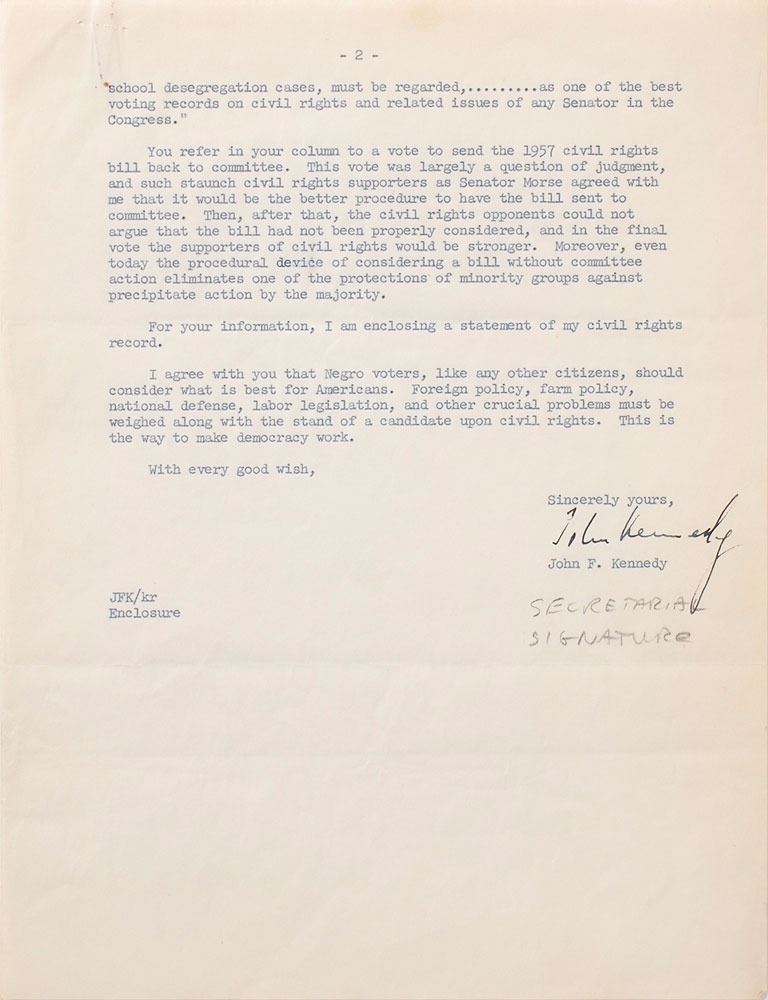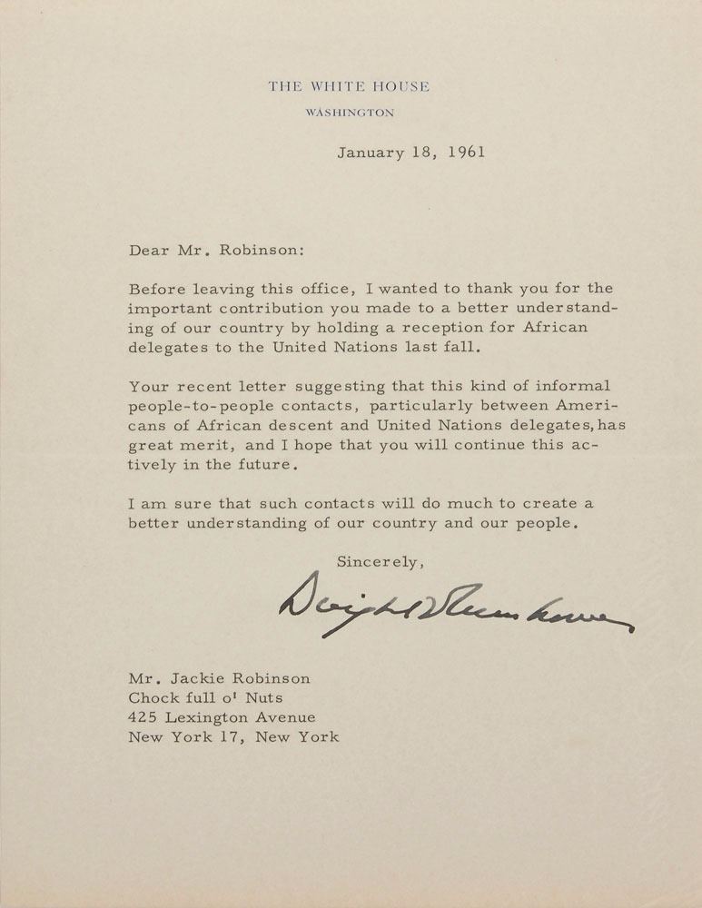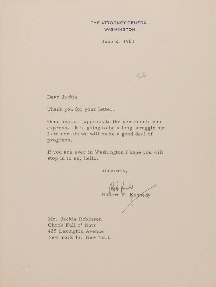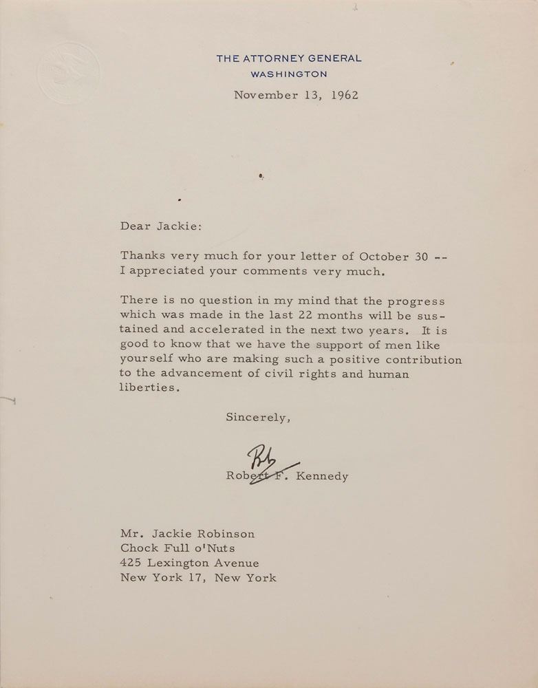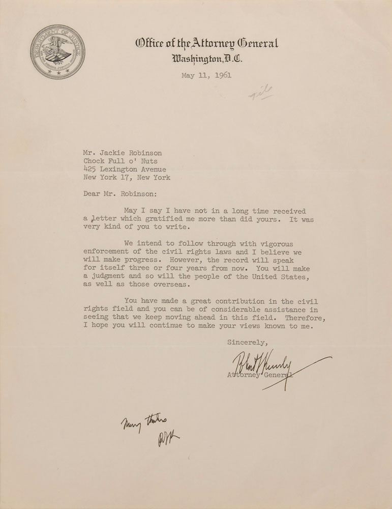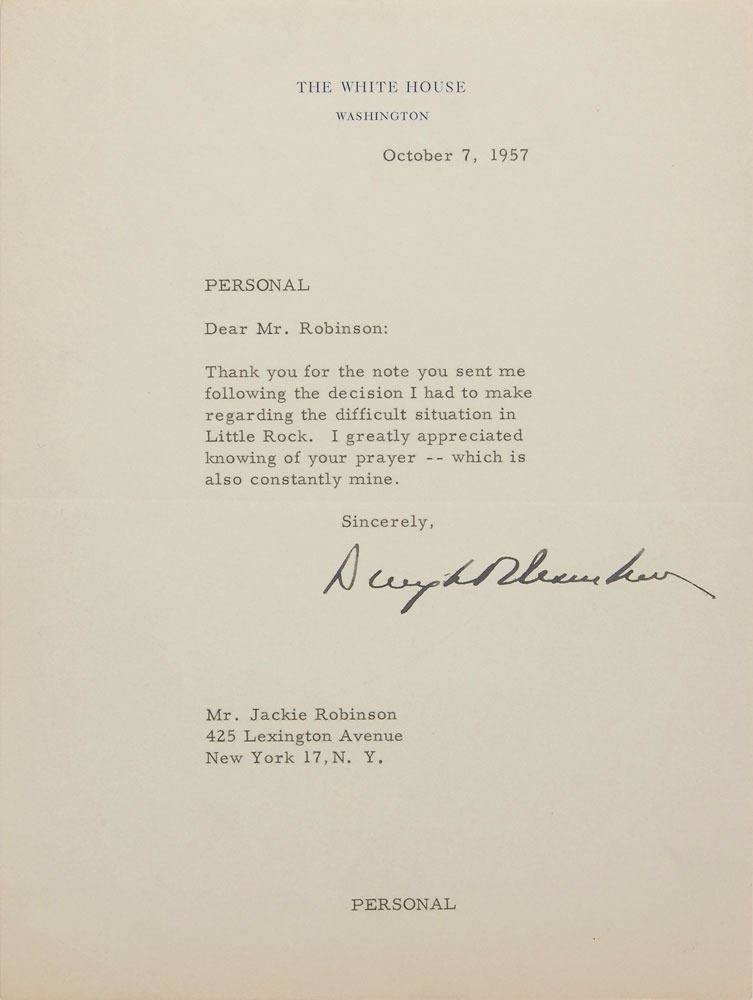 Historically interesting archive of six TLSs to Jackie Robinson, two by Dwight D. Eisenhower as president and four by Robert F. Kennedy as attorney general, totaling six pages, dated from 1957 to 1962. The first Eisenhower letter, October 7, 1957, in part: "Thank you for the note you sent me following the decision I had to make regarding the difficult situation in Little Rock. I greatly appreciated knowing of your prayer-which is also constantly mine." Eisenhower's second letter, written on January 18, 1961, just two days before leaving the White House, in part: "Before leaving this office, I wanted to thank you for the important contribution you made to a better understanding of our country by holding a reception for African delegates to the United Nations last fall. Your recent letter suggesting that this kind of informal people-to-people contacts, particularly between Americans of African descent and United Nations delegates, has great merit, and I hope that you will continue this actively in the future."