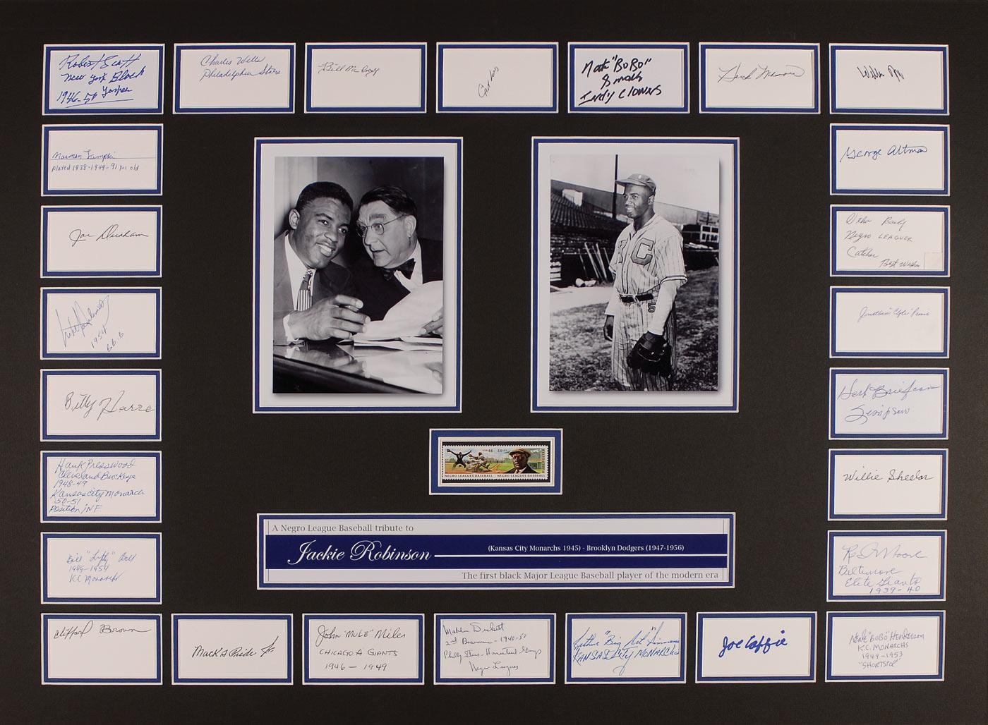 Ink and felt tip signatures of 26 Negro League legends on individual white cards, with some adding their respective teams, positions, and dates. Signers are: Robert Scott, Norman Lumpkin, Bill ‘Lefty’ Bell, Joe Durham, Mike Houlemard, Billy Harrell, Hank Presswood, Clifford Gibbons, Joe Caffie, John ‘Mule’ Miles, Arthur ‘Big Art’ Simmons, Neal ‘Bobo’ Henderson, Red Moore, Willie Sheelor, Herb ‘Briefcase’ Simpson, Jonathan ‘Clyde’ Parrish, Charles Wells, Hank Mason, Otha Bailey, Carl Long, William Blair, Nate ‘Bobo’ Smalls, Bill McCrary, George Altman, Mahlon Duckett, and Mack Pride. Double matted with two vibrant images of Jackie Robinson and two original Negro League US postage stamps to an overall size of 30 x 22. In fine condition.