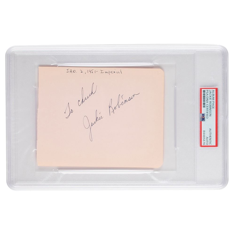 Sought-after vintage fountain pen signature and inscription, "To Chuck, Jackie Robinson,†on an off-white 5.75 x 4.5 album page, annotated along the top by the collector: "Jan. 2, 1951 - Imperial." In very fine condition. Encapsulated in a PSA/DNA authentication holder.