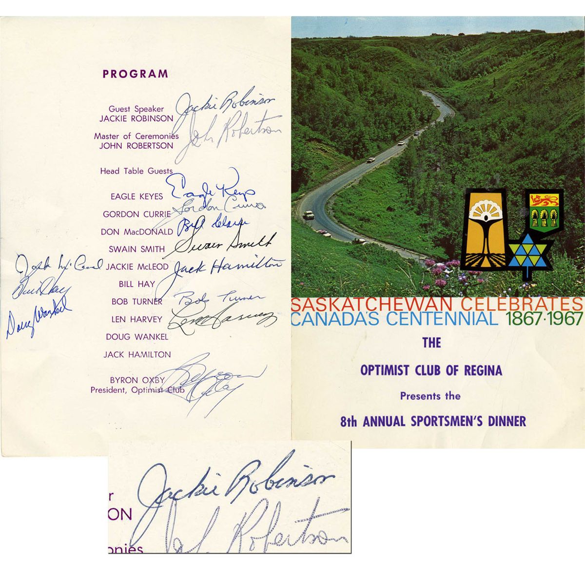 Baseball legend Jackie Robinson signed program from the 1967 Optimist Club's 8th Annual Sportsmen's Dinner during the Saskatchewan celebration of the Canadian Centennial. Signed clearly in blue ink: ''Jackie Robinson''. Other honorees, including John Robertson, NHL player Bill Hays and championship boxer Len Harvey, also sign the program. Four-page 6'' x 9'' program shows minor creasing and separation at fold, else very good. With PSA/DNA COA.