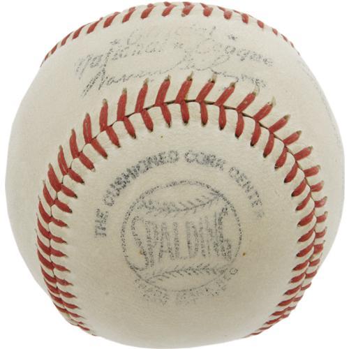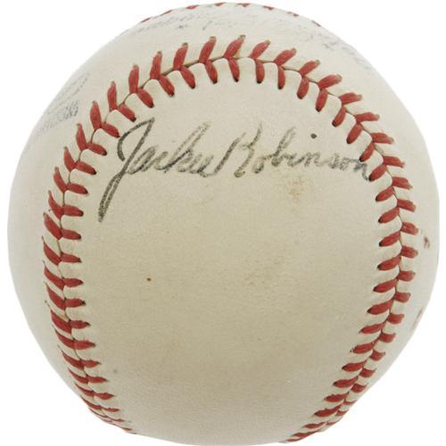 <B>1950's Jackie Robinson Single Signed Baseball.</B></I> While most baseball historians would crown the Babe as the most important figure in twentieth century baseball, a strong argument could be made for this man, who stood up to the taunts and threats of the bigoted masses using his Hall of Fame skill and quiet courage. One can't help but be inspired by this fine single, which finds Robinson applying his 9/10 black ink signature to the side panel of an ONL (Giles) ball. The sphere is lightly and evenly toned with a few speckles of foxing that do not approach the autograph. Robinson singles are unusually tough, and this is definitely one of the finest to reach the market in recent memory. It's an opportunity not to be taken lightly. <I>LOA from PSA/DNA.</B></I> <BR><BR><B>Important notice:</B> Heritage usually auctions material at the rate of 200-250 lots per hour. On some occasions eBay Live bid software or the Internet may not be able to keep up with the pace of the auction. We recommend placing a realistic absentee bid now as insurance to avoid disappointment. Occasionally the auctioneer may eliminate or reject an eBay Live bid, and the auctioneer may also reopen a lot after the close of the eBay live bidding (usually because we missed an audience bid), and may reject your bid even if it shows you as the winning bidder. By bidding via eBay Live, you agree that Heritage may award the lot to another bidder at its sole discretion under the circumstances described above or any other reasonable circumstances. Since eBay bids are not shown to us until we open the lot on the floor, we treat those bids just like floor bids. In most cases the floor responds before the eBay bid is presented to us, due to Internet lag time, so for consistency we have made it a policy that floor bids are always considered first over tie eBay live bids. Also please note that all Heritage lots purchased through eBay Live carry a 22.5% Buyer's Premium. Please make sure you read the Terms and Conditions before you bid. This lot is being auctioned in conjunction with a live floor auction by Heritage Galleries & Auctioneers. All final auction and invoice information will be supplied by Heritage Galleries & Auctioneers, and all other information should be considered preliminary. Lot:19021 <BR><BR><B>Winning Notification and Billing:</B> After the FINAL session in this auction is complete, Heritage will send e-mail and snail mail invoices. This process normally takes several days. All final auction and invoice information will be supplied by Heritage Galleries & Auctioneers, and all other information should be considered preliminary. <BR><BR>This auction will be conducted on a live auction floor and over the Internet through eBay Live. If you choose to place an absentee bid, please take a moment to <font color='#0000ff'><u><a href='http://pages.ebay.com/liveauctions/help/before/laabsentee.html'>learn how eBay Live absentee bidding works</a></u></font><font color='#000000'>