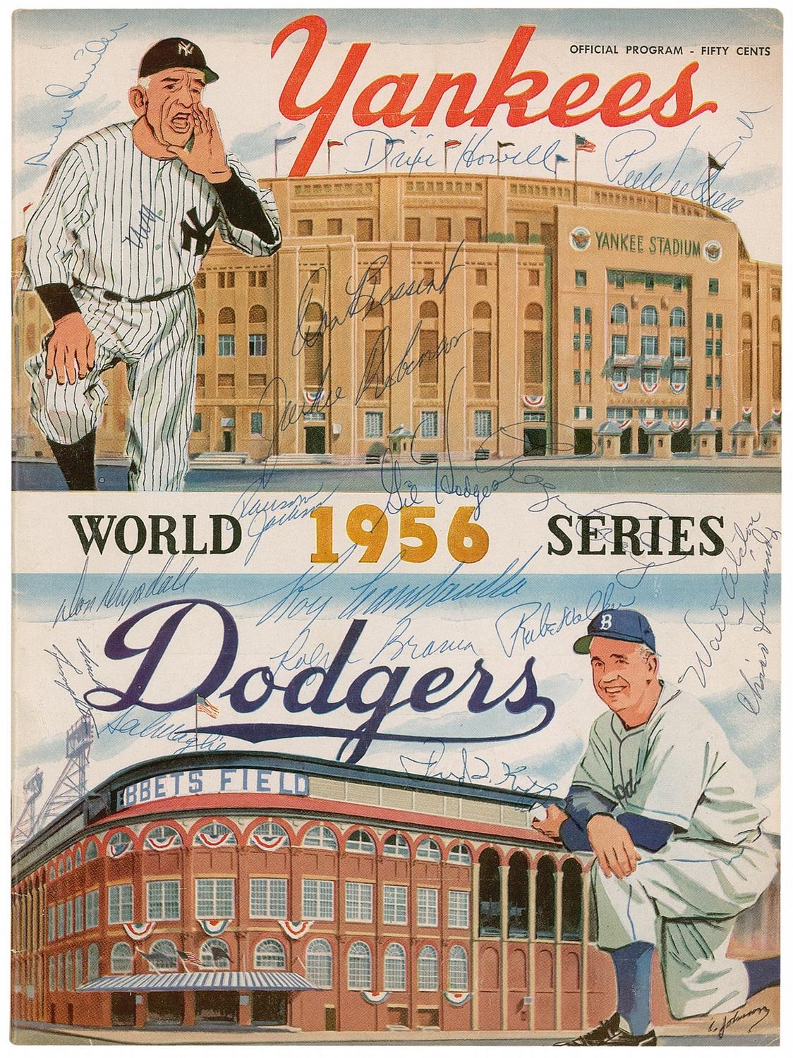 Original program from the 1956 World Series at Yankee Stadium, between the Yankees and Brooklyn Dodgers, 8.75 x 11.75, 48 pages, signed on the front cover in blue ink by 15 participants: Jackie Robinson, Roy Campanella, Walt Alston (manager), Don Drysdale, Gil Hodges, Sal Maglie, Dixie Howell, Ralph Branca, Roger Craig, Don Bessent, Ransom Jackson, Rube Walker, Chico Fernandez, Chuck Templeton, and Fred L. Kipp. Although Templeton and Kipp were not on the Dodgers during the World Series, they threw batting practice for the team during the Series. The autographs of Pee Wee Reese and Duke Snider have been identified as clubhouse examples. In fine condition, with mild handling wear and an ink mark to the front cover. Superb memento from the Fall Classic that gave baseball the only perfect game pitched in World Series history.