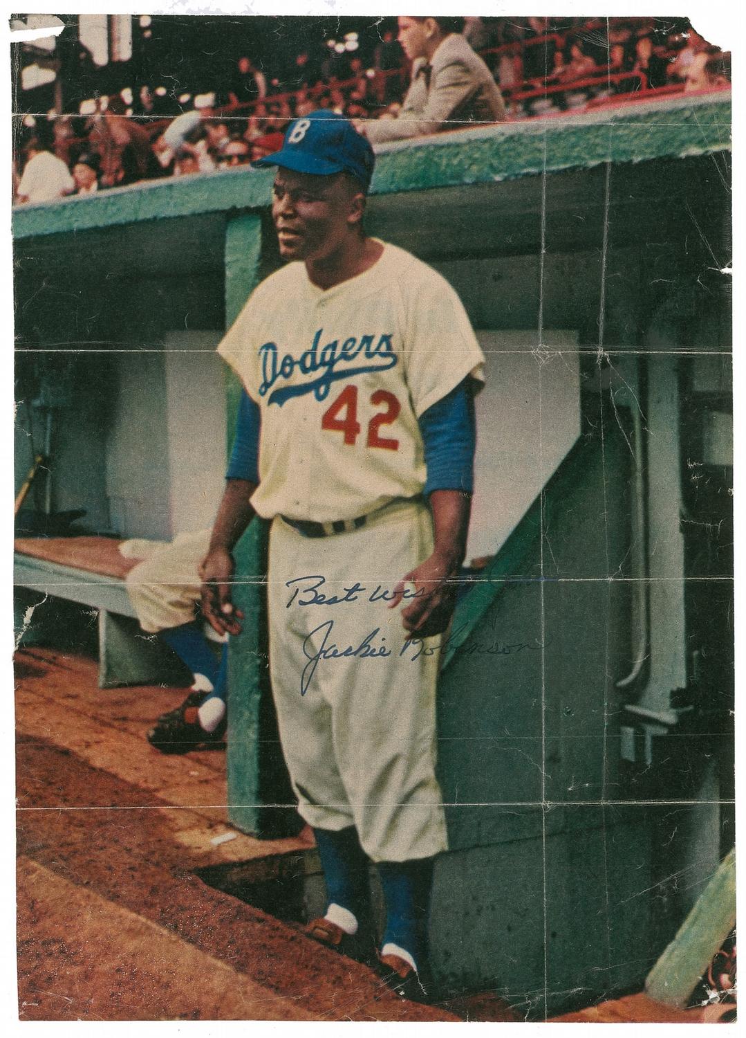 Color vintage 7.75 x 11 Sport magazine photo of Robinson in front of the Dodgers dugout before a game, signed in blue ink, “Best wishes, Jackie Robinson.” Light to moderate contrast to last name of signature, intersecting mailing folds, a few creases, and paper loss to three corners from previous display, otherwise very good condition.