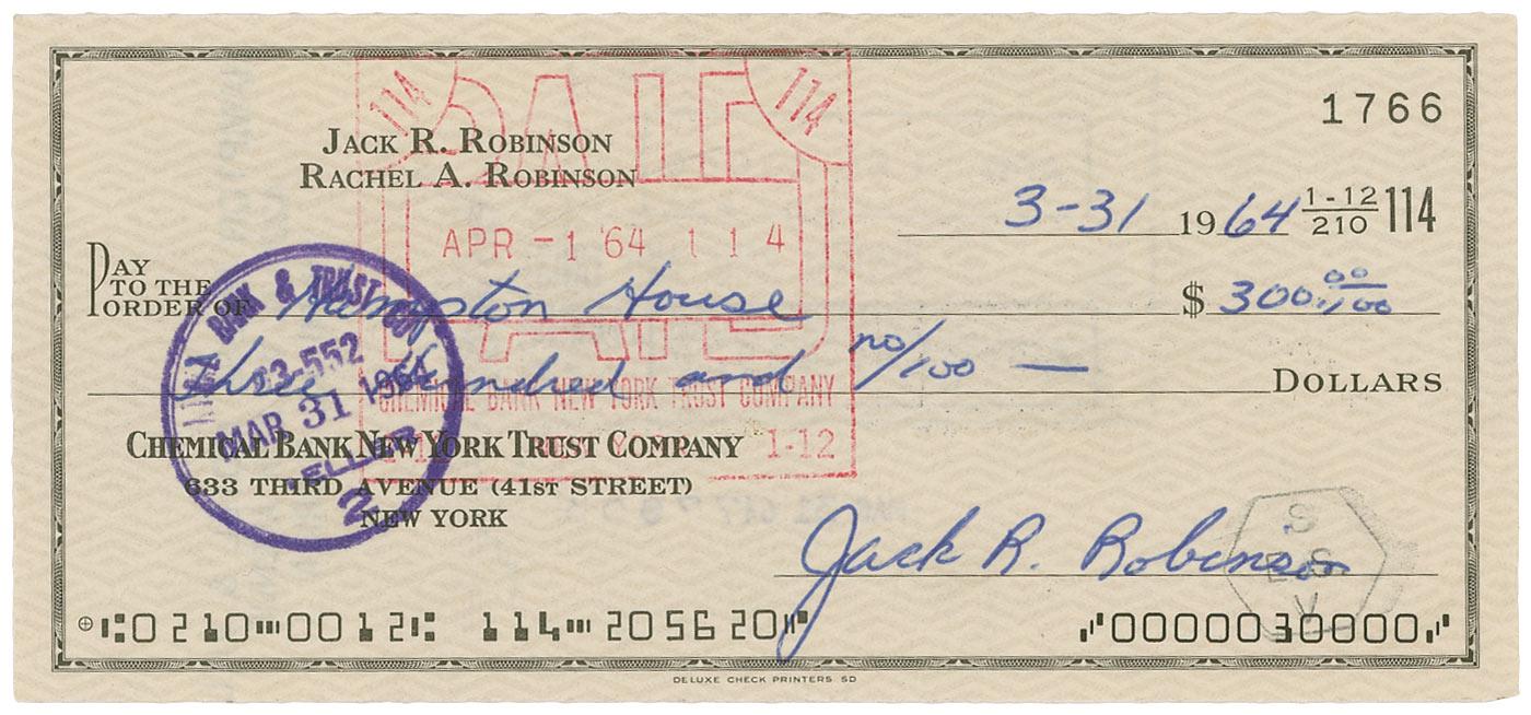 Personal check, 6 x 2.75, filled out and signed by Robinson, “Jack R. Robinson,” payable to Hampton House for $300.00, March 31, 1964. In fine, crisp condition, with expected cancellation stamps, one over final few letters of signature. A very well-preserved example from perhaps baseball’s most influential player.