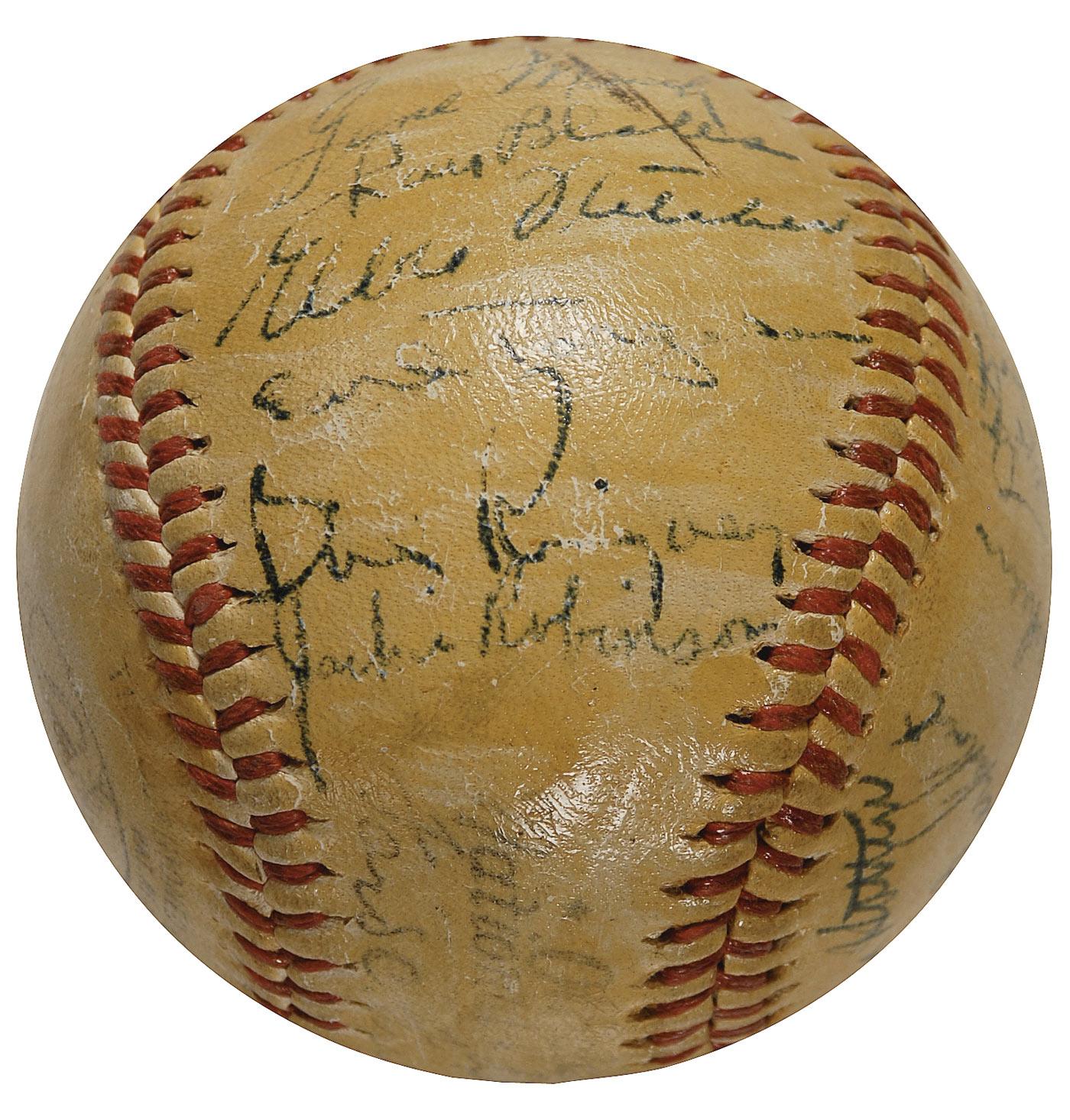 Official Spalding National League baseball signed on a side panel in blue ballpoint, “Jackie Robinson,” and also signed by 21 other National Leaguers including: Mel Ott, John Mize, and Al “Red” Schoendienst, Gene Mauch, Bill Rigney, Rip Sewell, Joe Garagiola, Jim Bagby, Jr., Ray Blades (coach), Harry Brecheen, Ken Burkhart, Elbie Fletcher, Joe Hatten, Kirby Higbe, John “Spider” Jorgensen, Willard Marshall, Fred Schmidt, Earl Torgeson, Roger Wolff, and two others. Ball has been heavily shellacked, some signatures fairly light, but still legible, and also with scattered ink loss to a few of the signatures, otherwise very good condition.