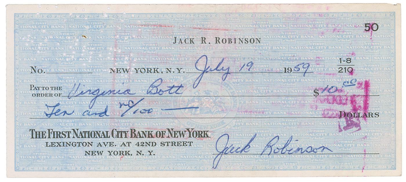 Personal check, 6.25 x 2.75, filled out and signed by Robinson,”Jack Robinson,” payable to Virginia Bott for $10.00, July 19, 1959. In fine condition, with expected cancellation holes and show-through from a stamp on reverse, not affecting the clean signature area.