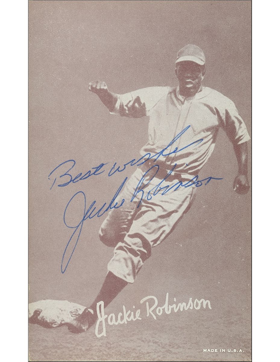 Original vintage exhibit card, 3.25 x 5.25, featuring an image of Robinson rounding a base, signed in blue ballpoint, “Best wishes, Jackie Robinson.” In fine condition, with a couple scattered light surface marks. Accompanied by the original mailing envelope, postmarked October 13, 1964.