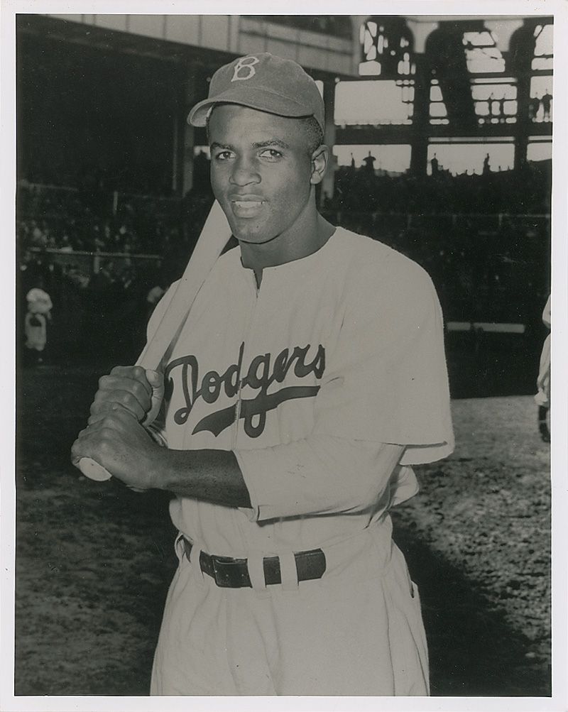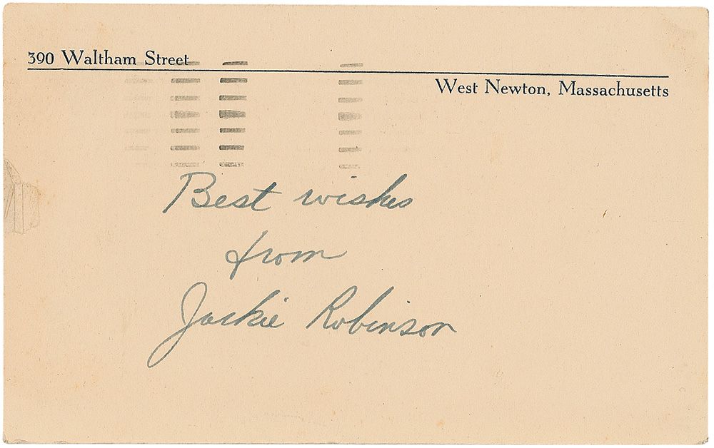 Vintage fountain pen signature, “Best wishes, from Jackie Robinson,” on an off-white 5.5 x 3.25 government postcard (postmarked 12/16/1948). In fine condition, with a small area of surface paper loss to the left edge, well away from signature, and a cancellation stamp above the signature. Accompanied by an unsigned satin-finish 8 x 10 photo of Robinson posing in his Dodgers uniform.