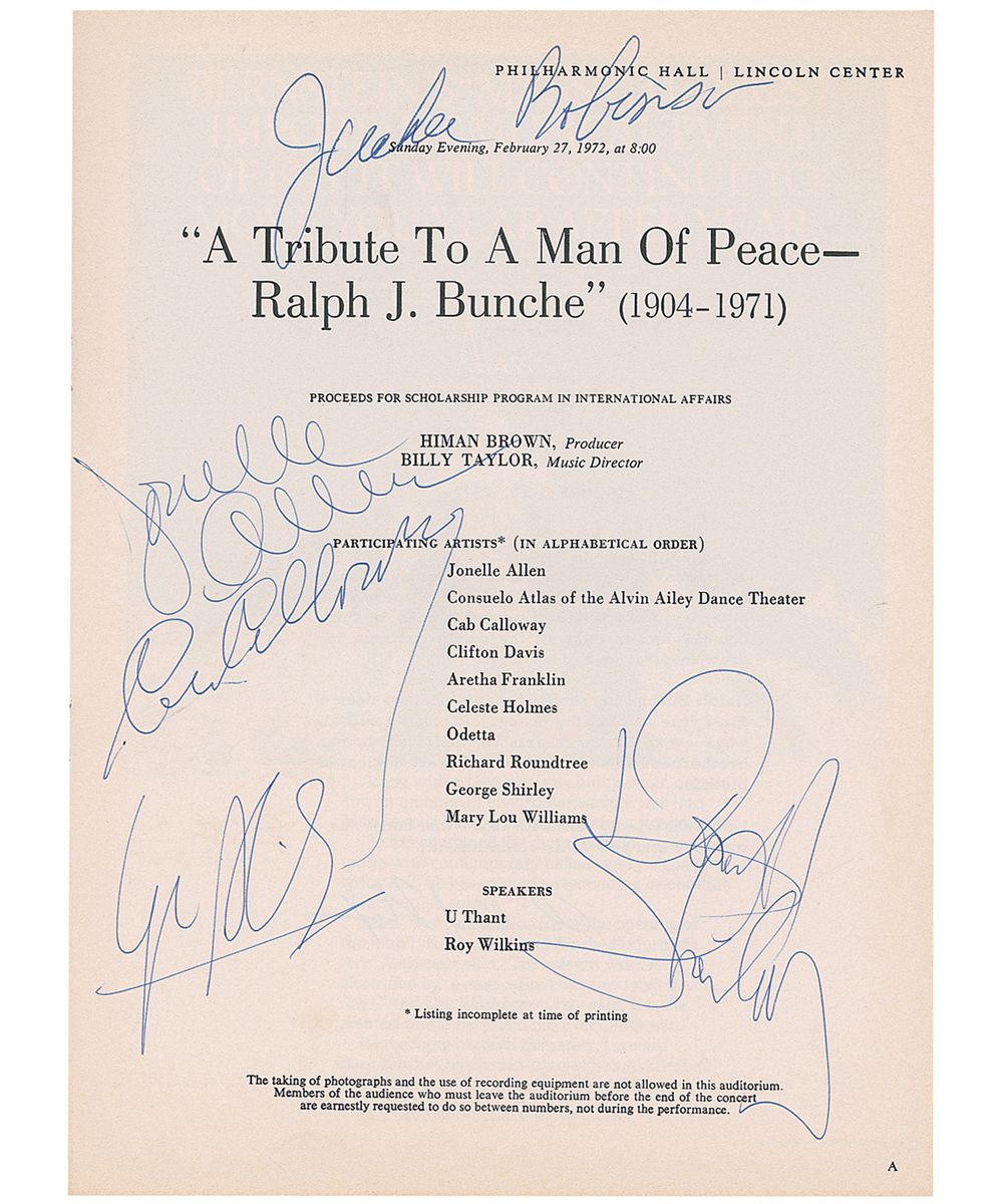 Program for the Philharmonic Hall at Lincoln Center, 8 x 11, 38 pages, February 1972, signed on a page inside by baseball Hall of Famer Jackie Robinson and jazz musicians Janelle Allen, Cab Calloway, George Shirley, and Don Shirley. In fine condition, with a couple light creases to the cover and toning to inside pages.