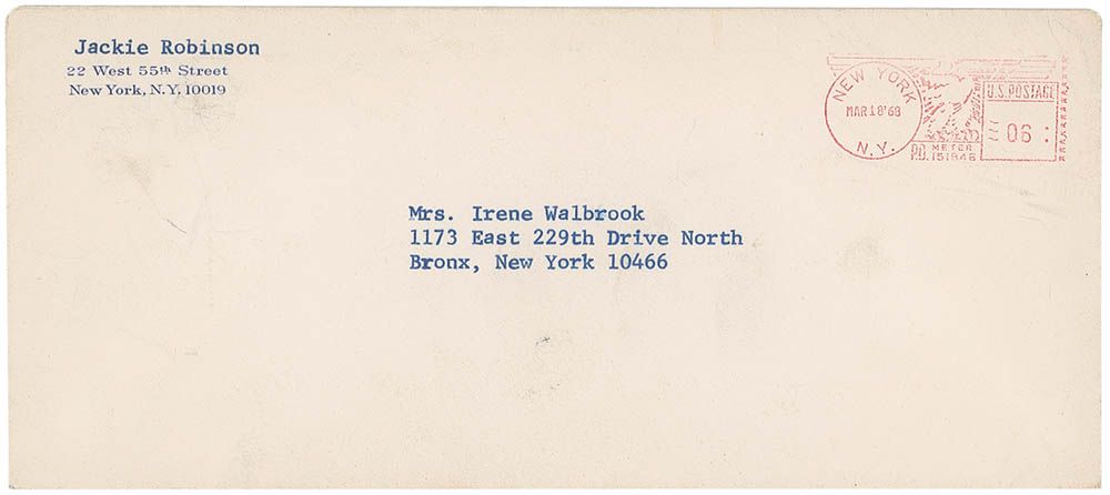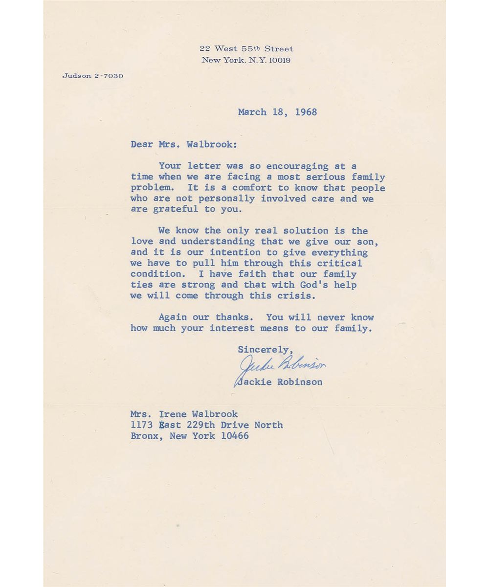 TLS, one page, 7.25 x 10.5, personal letterhead, March 18, 1968. Robinson writes Irene Walbrook of the Bronx regarding his troubled son. In full: “Your letter was so encouraging at a time when we are facing a most serious family problem. It is a comfort to know that people who are not personally involved care and we are grateful to you. We know the only real solution is the love and understanding that we give our son, and it is our intention to give everything we have to pull him through this critical condition. I have faith that our family ties are strong and that with God's help we will come through this crisis. Again our thanks. You will never know how much your interest means to our family.” In fine condition. Accompanied by the original mailing envelope. Fortunately, Robinson’s prediction was correct, as his son eventually became a counselor at the same facility that helped him break his addiction—only to die in a 1971 car crash.