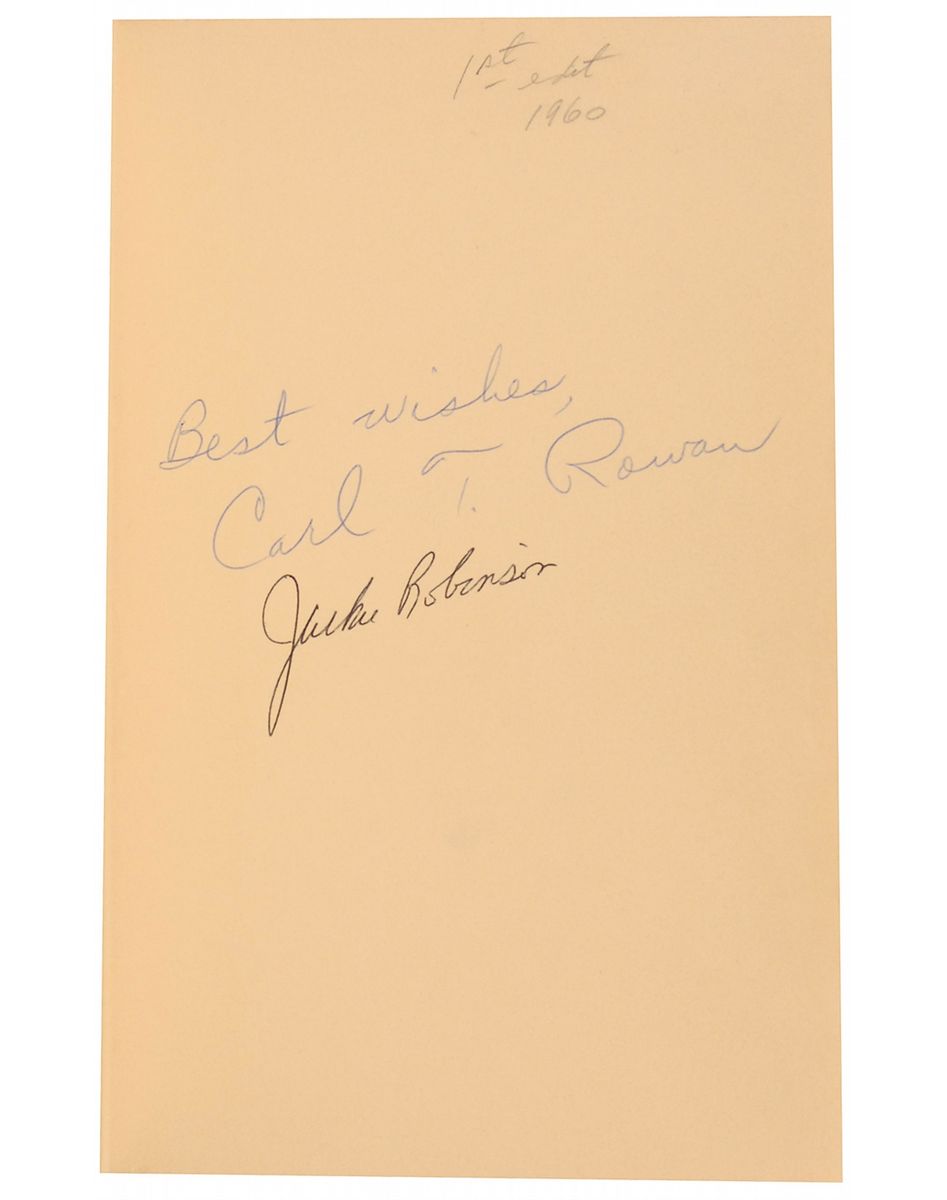 Signed book: Wait Till Next Year. First edition, first printing. NY: Random House, 1960. Hardcover with dust jacket, 6 x 9.25, 339 pages. Signed on the first free end page in black ballpoint, “Jackie Robinson,” and blue ballpoint by his co-author, “Best wishes, Carl T. Rowan.” Autographic condition: fine. Book condition: VG+/VG-. Accompanied by a full letter of authenticity from PSA/DNA.