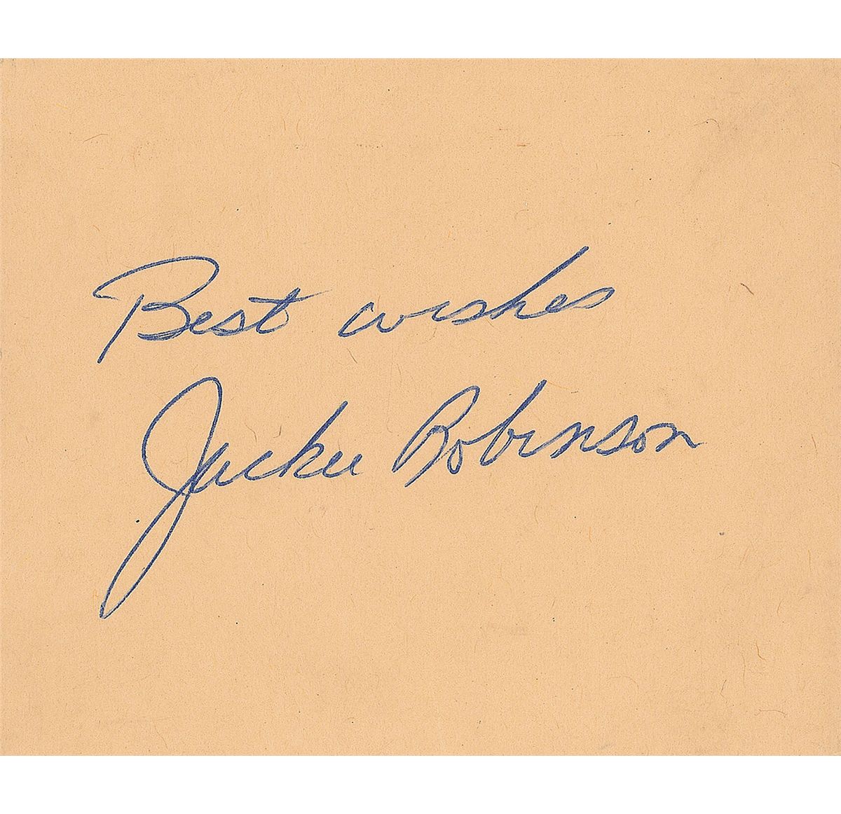 Exceptional ballpoint signature, “Best wishes, Jackie Robinson,” on an off-white 3.5 x 3 card. In very fine condition.