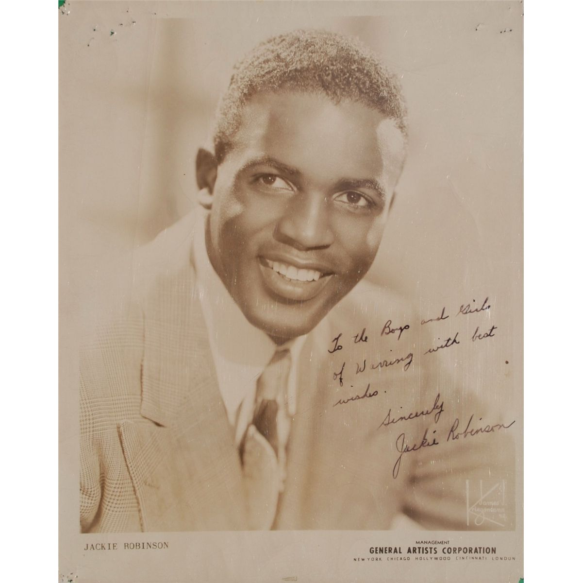 Beautiful studio(General Artists Corporation) 8" by 10" photo of Jackie Robinson dressed in a suit, signed on the front in near perfect looking 9/10 blue ink "To the Boys and Girls of Warring with best wishes Sincerely, Jackie Robinson". Photo itself does have some creasing and a multitude of pin holes at all four corners.(This resulted in a small piece of paper loss at lower right). Small 1/4" area of adhesive residue across the top back edge of photo.