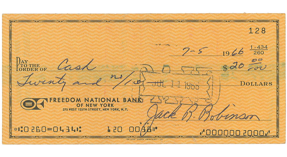 Choice bank check, 6 x 2.75, filled out and signed by Robinson, “Jack R. Robinson,” payable to cash for $20, July 5, 1966. In fine condition, with expected bank stamps. A desirable format featuring Robinson’s more formal signature.