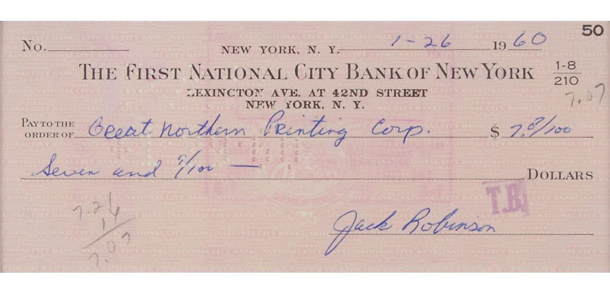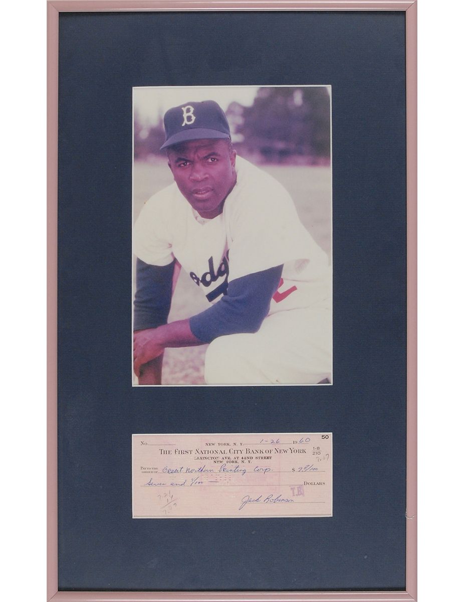 Bank check, 5.75 x 2.5, filled out and signed by Robinson, “Jack Robinson,” payable to Great Northern Printing Corp. for $7.07, January 26, 1960. Double-matted and framed with a color image of Robinson kneeling in his Brooklyn Dodgers uniform to an overall size of 11.25 x 18.25. In fine condition, with expected bank stamps and cancellation holes, and two small pencil notations in another hand. Originally from the Robinson family archives, and accompanied by a letter of provenance signed by his wife, Rachel Robinson.