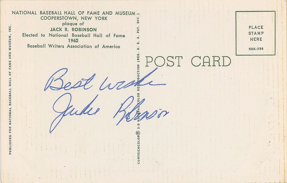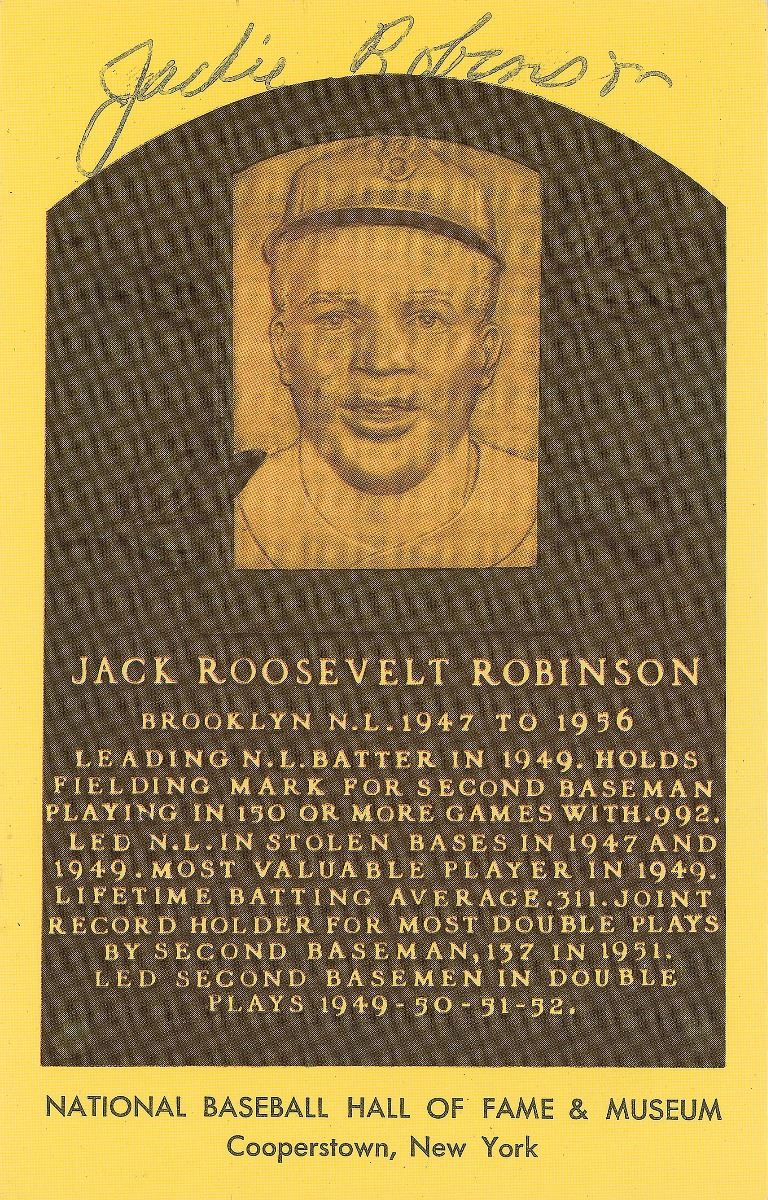 Highly desirable gold Hall of Fame plaque card signed across the top in blue ballpoint, “Jackie Robinson,” and on the reverse, “Best wishes, Jackie Robinson.” In fine condition.