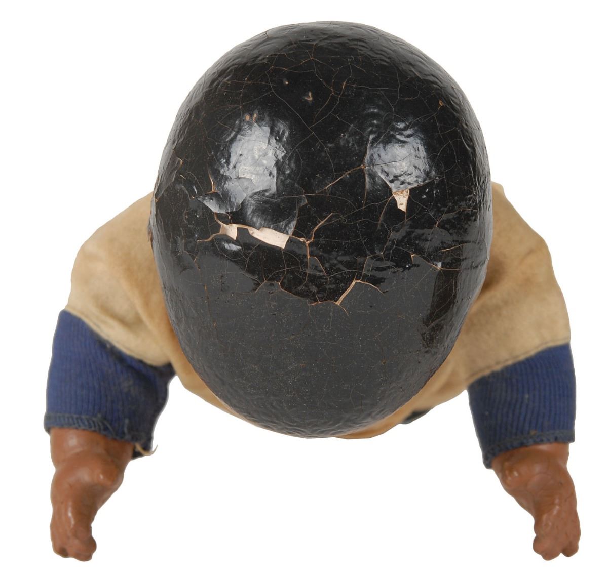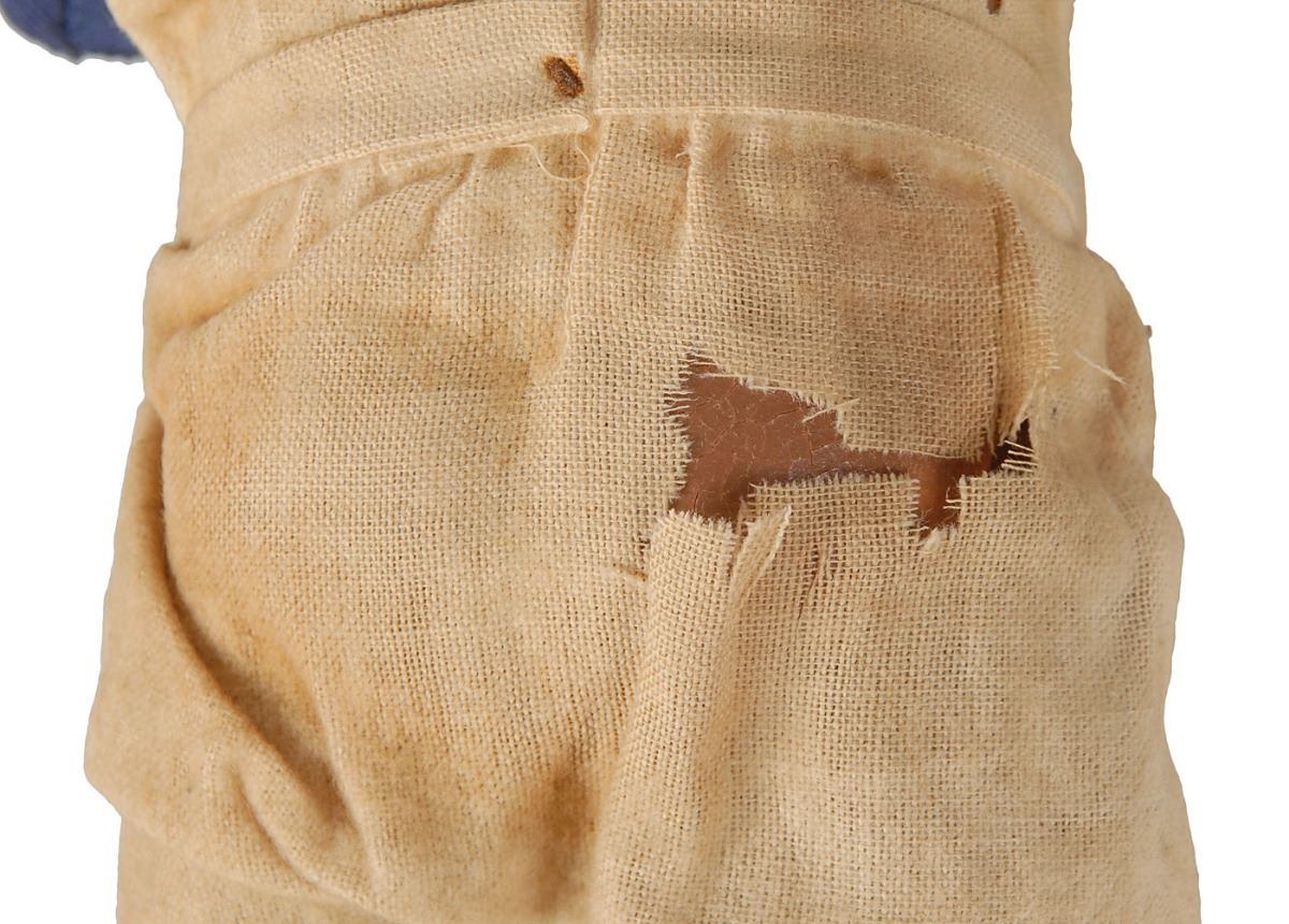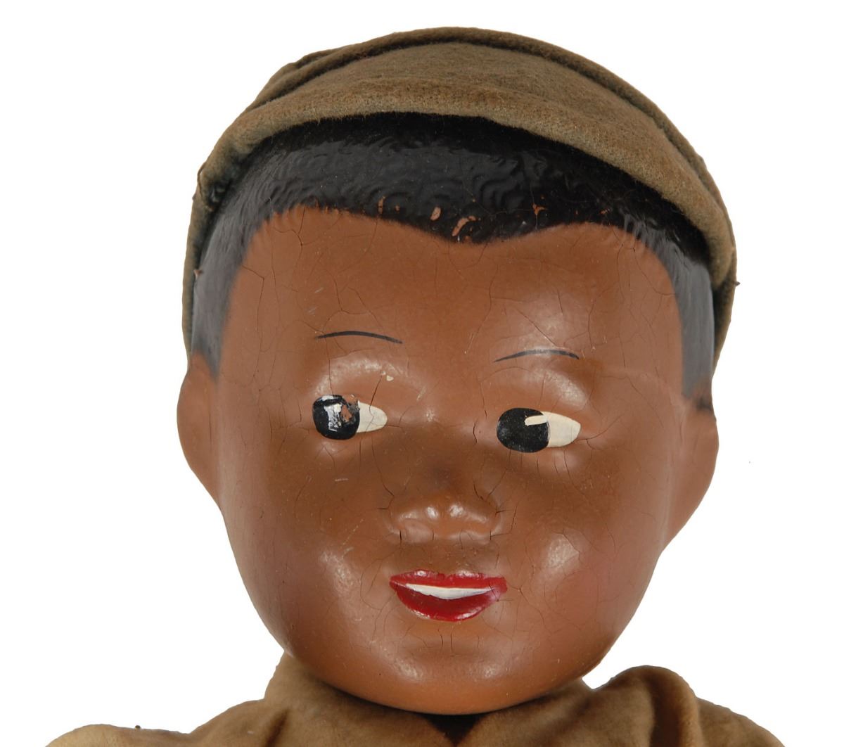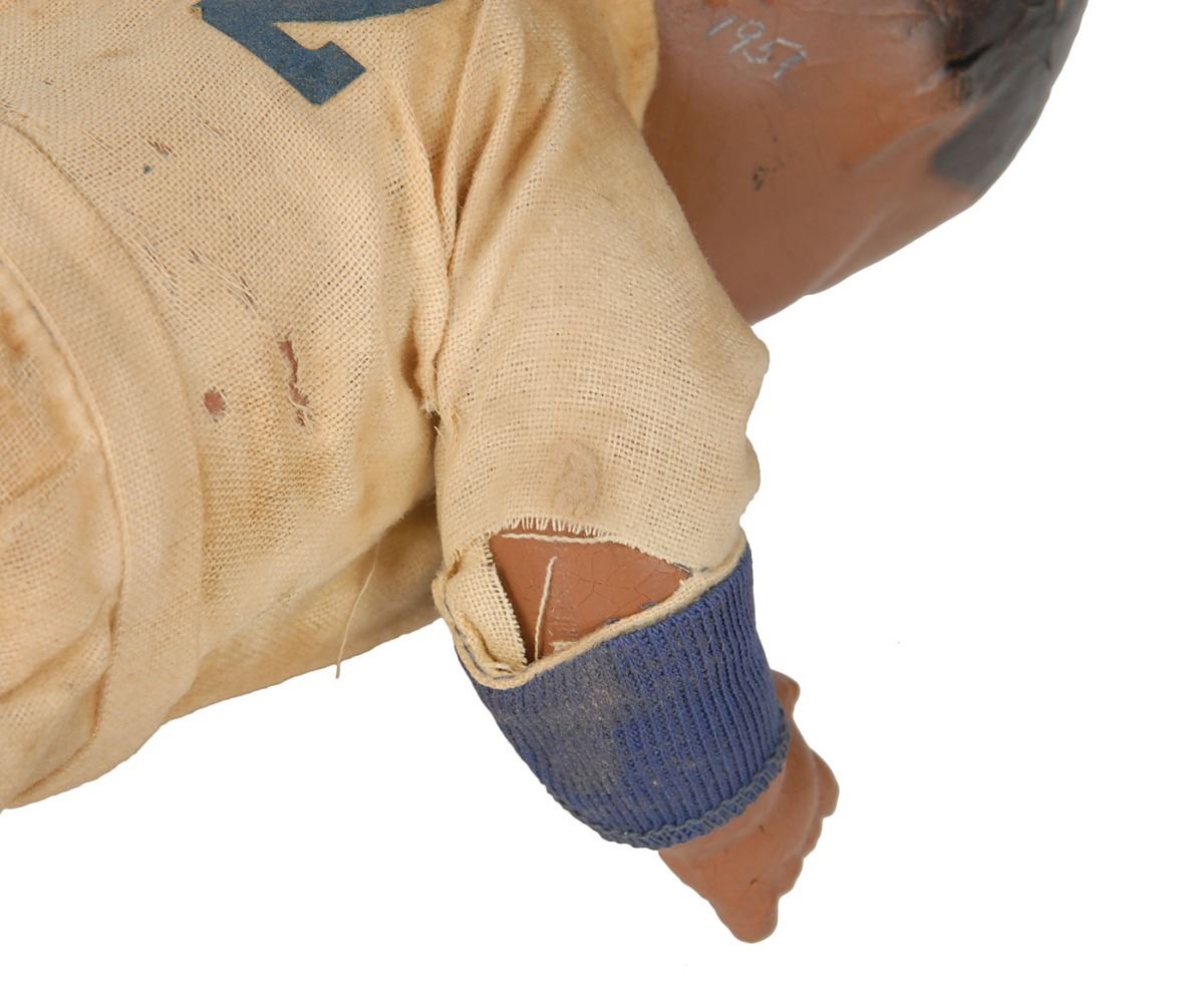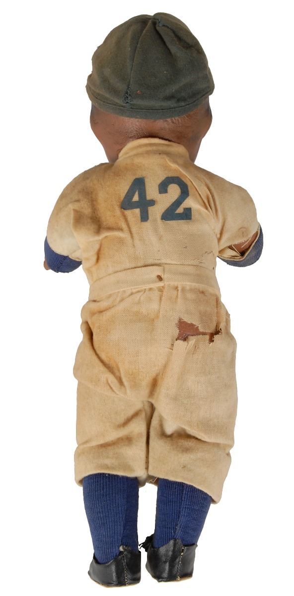 Vintage circa 1951 composition Jackie Robinson doll issued by Allied Grand Manufacturing Co., measuring 13? tall, with moveable arms, legs, and head. The doll retains its Brooklyn Dodgers cap, original shoes, and uniform with the number “42” on the back. In good to very good condition, with scattered cracking and some loss to paint (most significantly to the top of his head, covered if wearing the cap), overall soiling and various tears to uniform, “Dodgers” missing from front of jersey, and a “1951” notation to his neck.