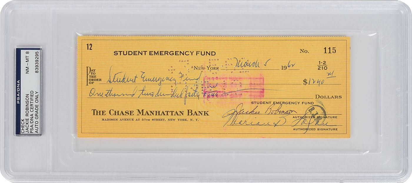 Student Emergency Fund check, 8.25 x 3, filled out in another hand and signed by Robinson, "Jackie Robinson," payable to Student Emergency Fund for $1240.24, March 5, 1962. Also signed by Marian B. Logan, a longtime associate of Dr. Martin Luther King, Jr. Encapsulated in a plastic PSA/DNA authentication and grading holder, evaluating the autograph as "NM-MT 8." In fine condition. In April 1960, Robinson and Logan founded the Student Emergency Fund as a means to 'help Negro and white students jailed in sit-in demonstrations in the South.'