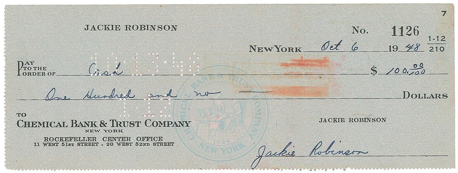 Personal check, 8.25 x 3, filled out and signed neatly by Jackie Robinson, payable to Cash for $100, October 6, 1948. In fine condition.
