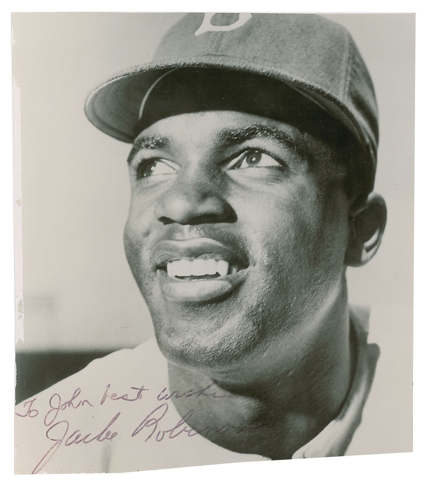 Glossy 7 x 8.25 photo of the Brooklyn Dodgers second baseman in a cheerful close-up pose, signed and inscribed in black felt tip, "To John, best wishes, Jackie Robinson.” In very good to fine condition, with irregularly trimmed edges, a few small creases, a strip of emulsion loss along the left edge.