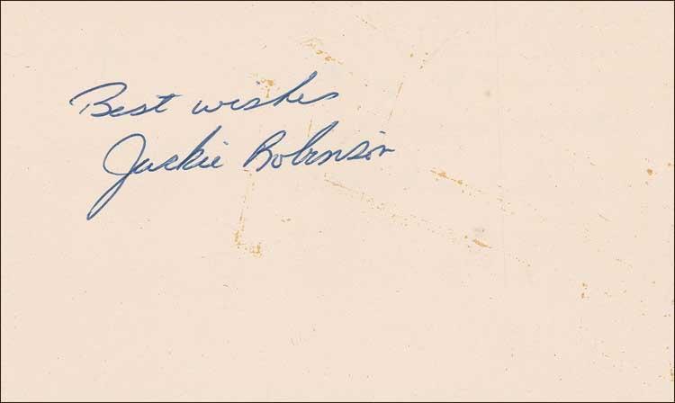 Vintage ballpoint signature, “Best wishes, Jackie Robinson,” on an off-white 5 x 3 card. In fine condition, with a bit of scattered light toning, lightly affecting small portions of signature. Pre-certified Steve Grad/PSA/DNA and RRAuction COA.