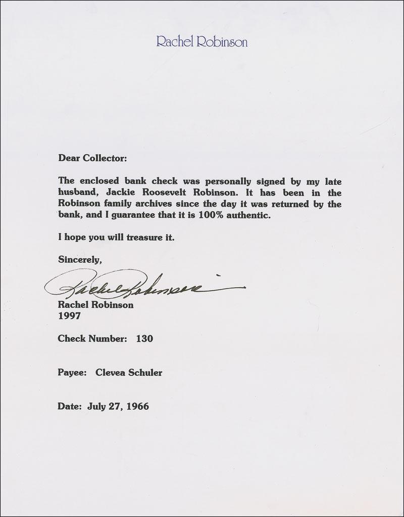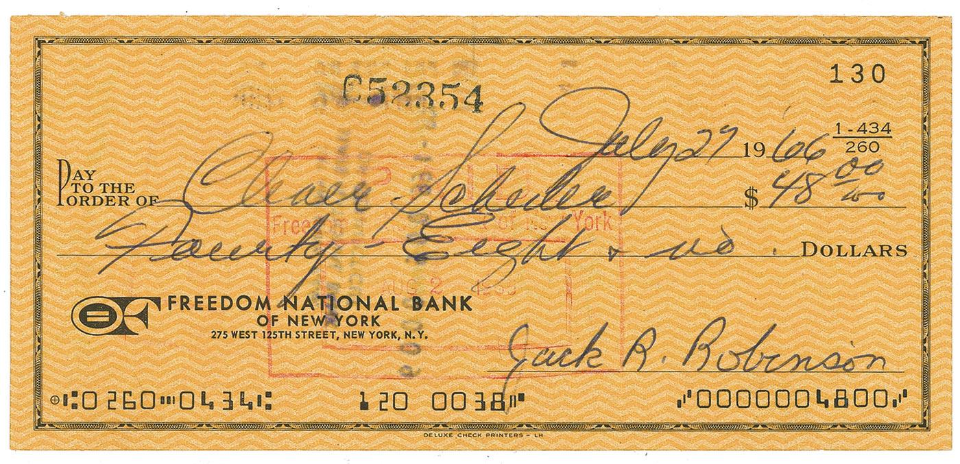 First African American Major League Baseball player of the modern era in 1947. In recognition of his accomplishments both on field and off of it, every Major League Baseball team has retired the number 42. Personal check, 6 x 2.75, filled out in another hand and signed by Robinson, “Jack R. Robinson,” payable to Cleava Schuler for $48.00, July 27, 1966. A central vertical fold, and expected stamps to both sides, one lightly over first name of signature, otherwise fine condition. Accompanied by letter of authenticity from his widow, Rachel Robinson.