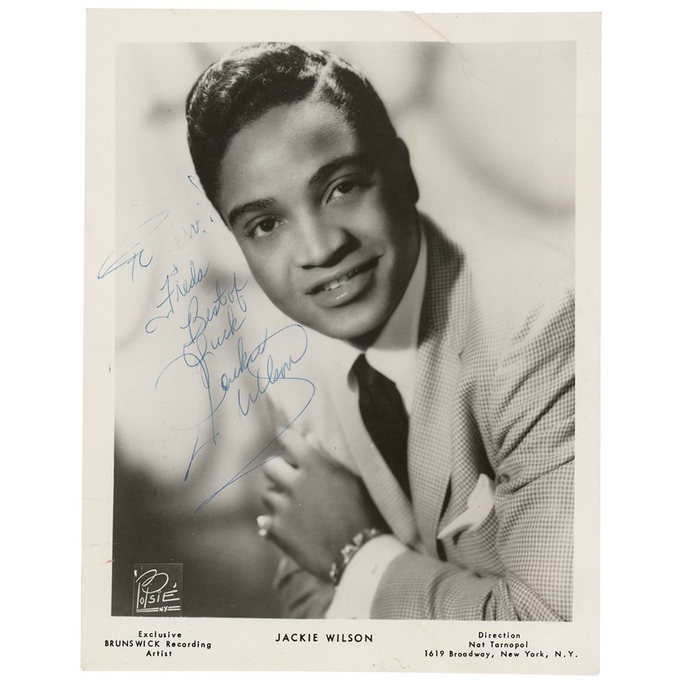 Vintage glossy 8 x 10 publicity photo of Brunswick recording artist Jackie Wilson, signed and inscribed in blue ballpoint, "To Irv & Freda, Best of luck, Jackie Wilson." In very good to fine condition, with skipping to the start of the signature and inscription, scattered light creasing, and a heavier crease near the top edge. Provenance: The Larry Rafferty Collection.
