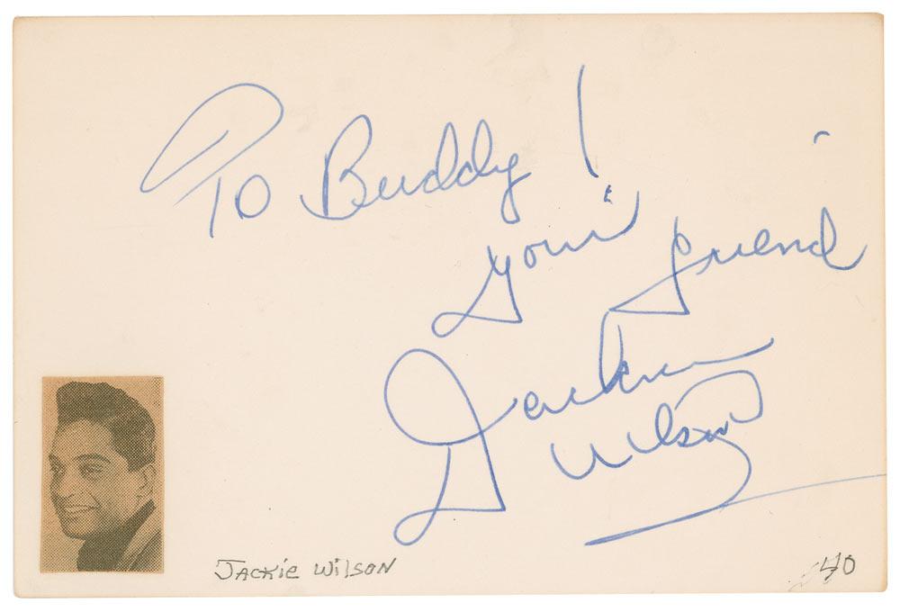 American soul and R&B singer (1934–1984) best known for such hits as “To Be Loved” and “Lonely Teardrops.” After suffering a heart attack while onstage in 1975, Wilson remained in a coma until his death nearly a decade later at the age of 49. Vintage fountain pen signature and inscription, “To Buddy! Your friend, Jackie Wilson,” on an off-white 6 x 4 card, with a clipped photo of Wilson affixed to lower left corner. In fine condition, with a couple small notations along bottom.