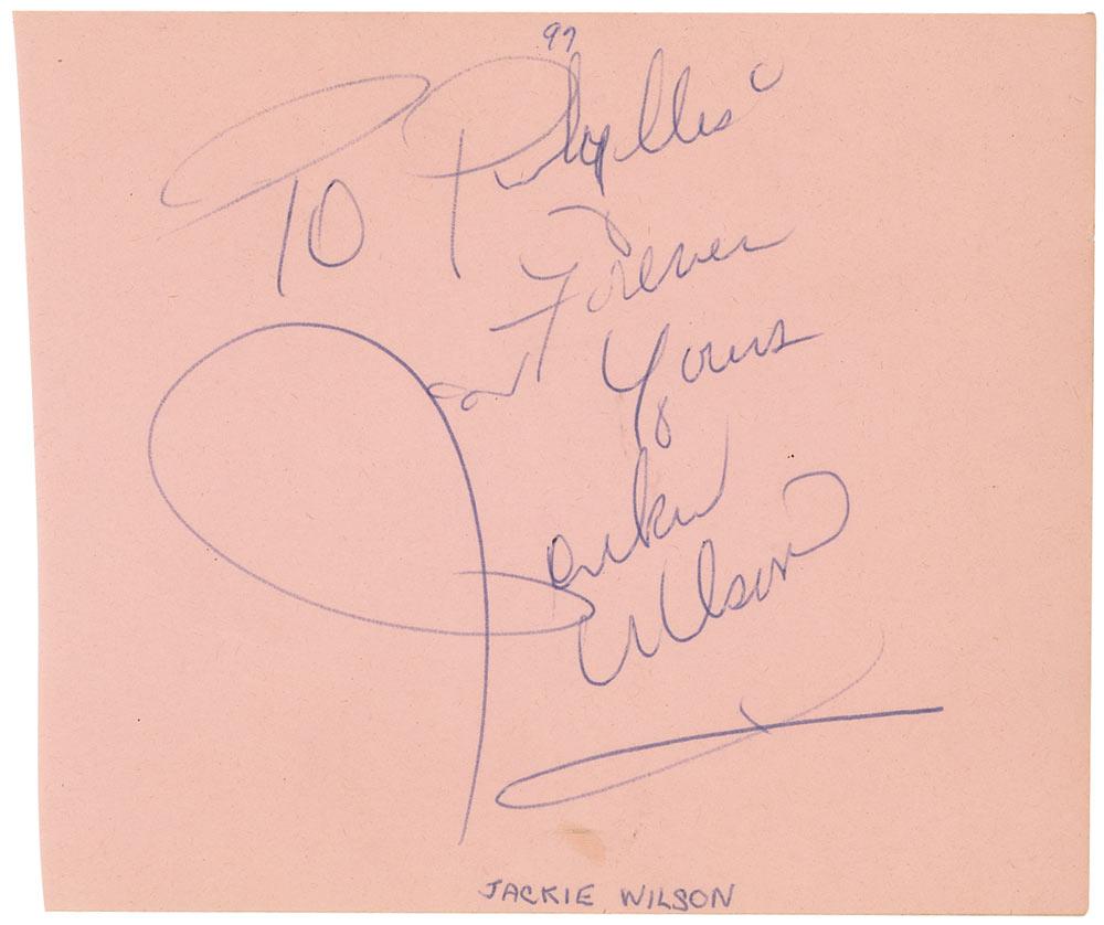 American soul and R&B singer (1934–1984) best known for such hits as ‘To Be Loved’ and ‘Lonely Teardrops.’ After suffering a heart attack while onstage in 1975, Wilson remained in a coma until his death nearly a decade later at the age of 49. Crisp ballpoint inscription, “To Phyllis, Forever Yours, Jackie Wilson,” on a salmon 5 x 4.25 album page. In fine condition, with clipped edges and a trivial soil mark.