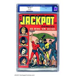 Jackpot Comics #2 Chicago pedigree (MLJ, 1941) CGC VF+ 8.5 Off-white pages. This is an outstanding copy from the Chicago collection. Finding MLJs in this shape is practically impossible. If you aren't already familiar with the Chicago pedigree, then you should definitely look into it. These books are nice! Overstreet 2002 VF 8.0 value = $852. Important notice: We expect to be auctioning lots at the rate of 200-250 per hour. Sometimes eBay Premier live bid software cannot keep up with that pace, so we strongly recommend that you place a realistic proxy bid now as insurance to avoid disappointment. Also please note that all Heritage/CAA lots purchased through eBay Premier carry a 20% Buyer's Premium. Please make sure you read the Terms and Conditions.