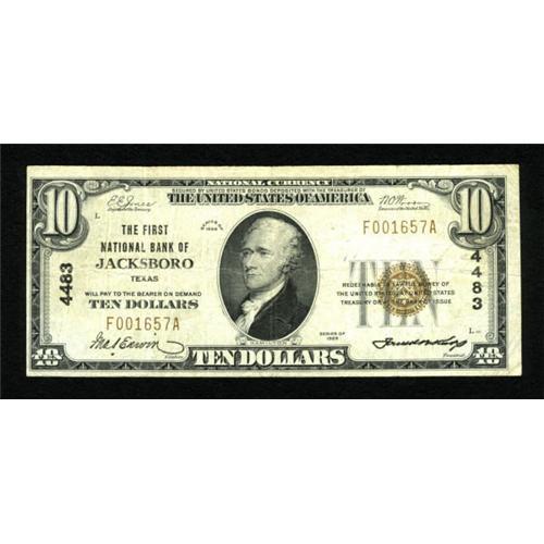 <B>Jacksboro, TX</B></I> - $10 1929 Ty. 1 <B>The First NB</B></I> Ch. # 4483<BR> A few tiny pinholes are noticed along the right side of this note which was a souvenir at one time. <B>Fine</B></I>.<BR><I>From The Rolling Plains Collection</B></I><BR><BR><b>Shipping:</b> Coins & Currency (<a target="_blank" href="http://www.heritageauctions.com/common/shipping.php">view shipping information</a>)