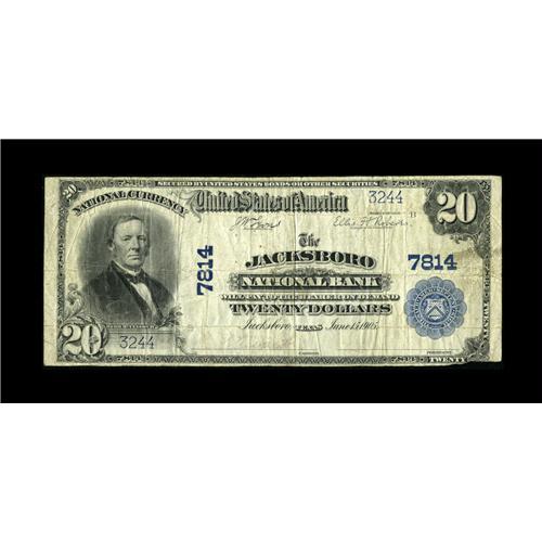 <B>Jacksboro, TX</B></I> - $20 1902 Plain Back Fr. 650 <B>The Jacksboro NB</B></I> Ch. # 7814<BR>This is a prohibitively rare bank in large size, with two of the three notes recorded in the census permanently off the market while being housed in the Moody Foundation holdings. Even the massive Irish collection lacked a large note from here. <B>Fine-Very Fine.</B></I>